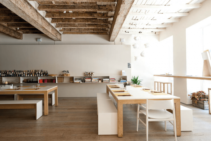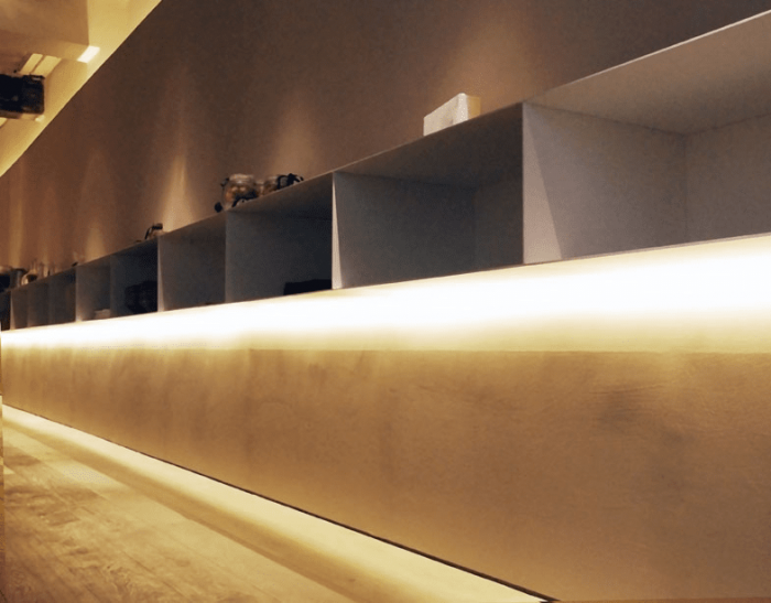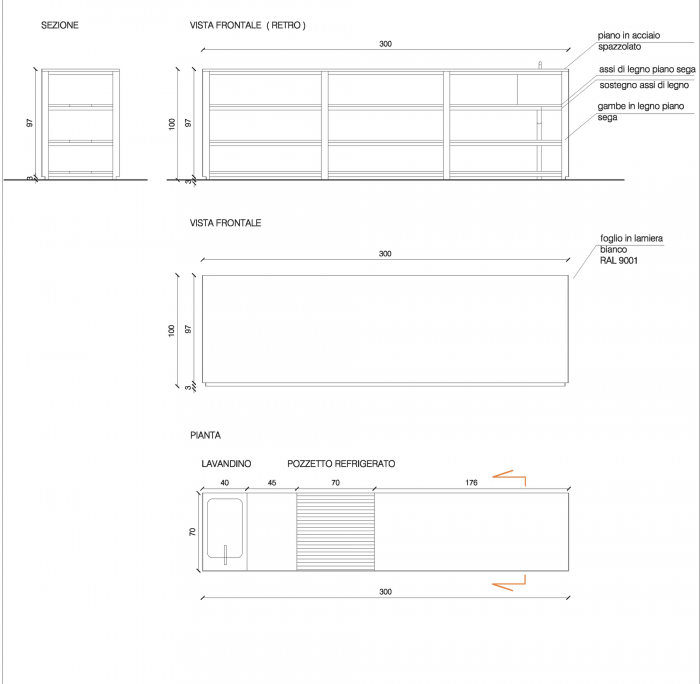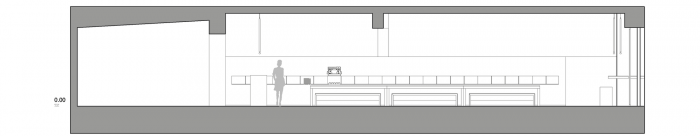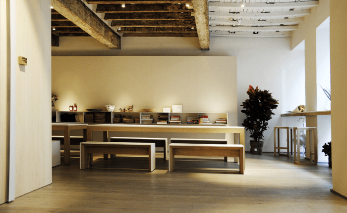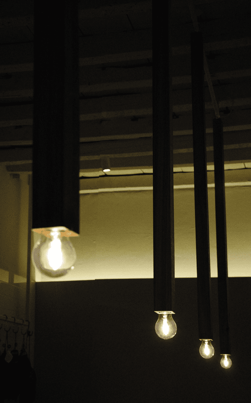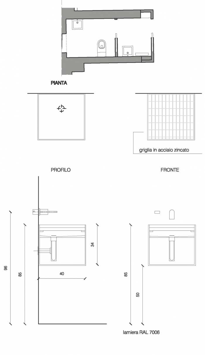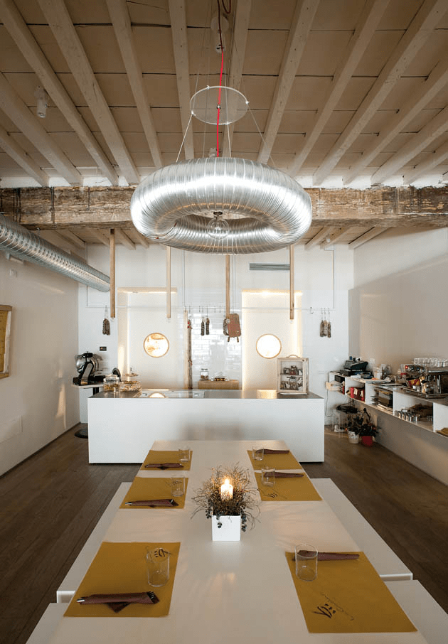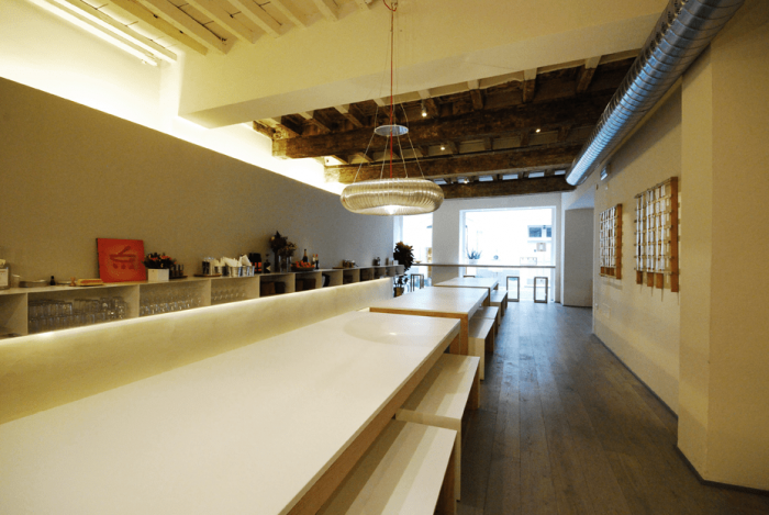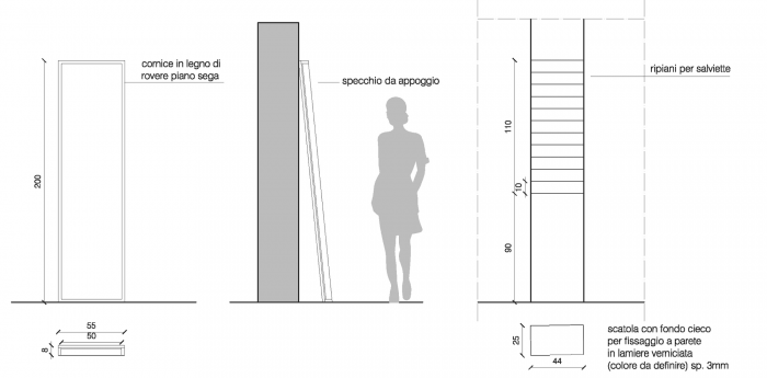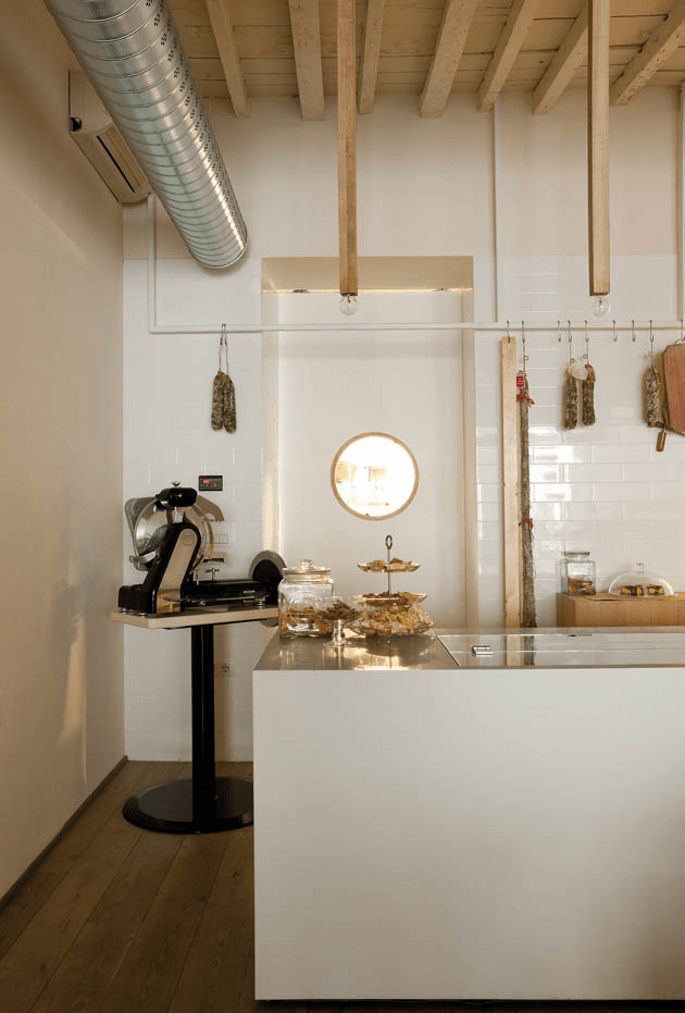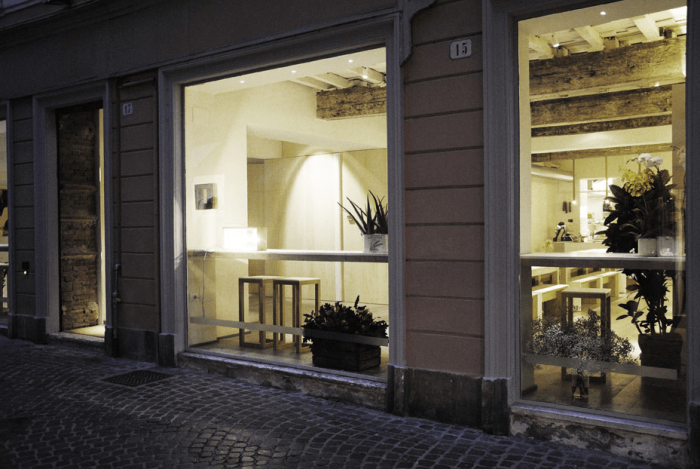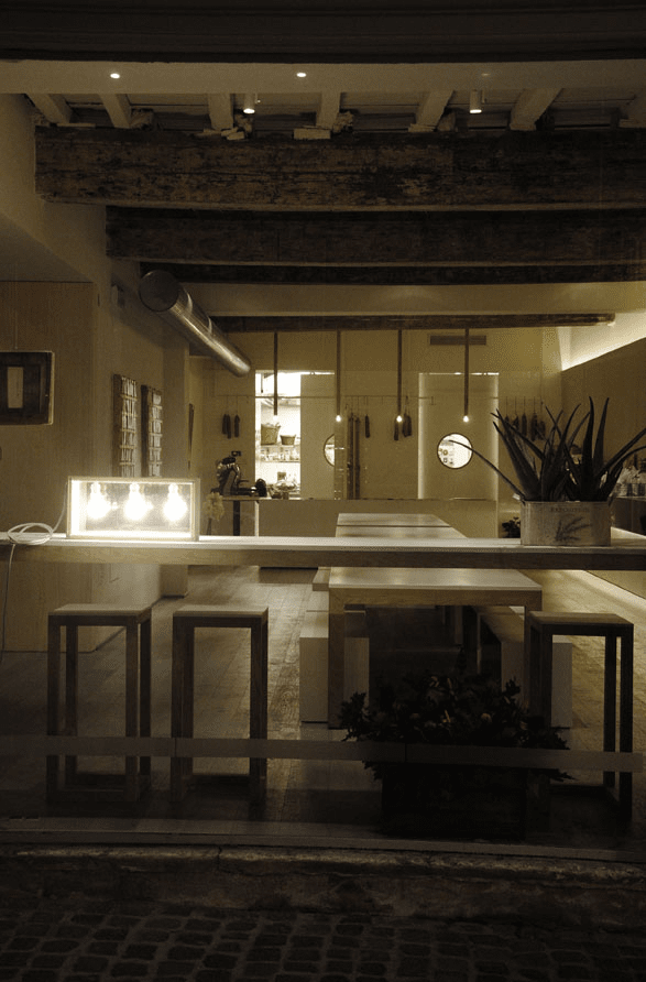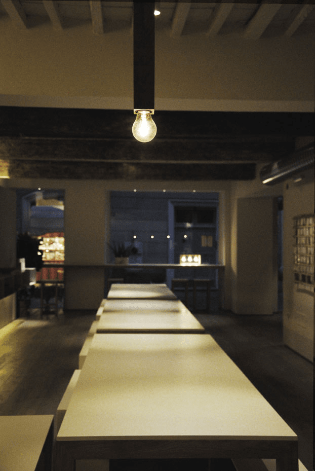 All used furniture as benches, stools, tables, serving counter, sink, toilet and incandescent lamps have been custom designed, only exceptions being the Porro seats and led lighting (from I LED).