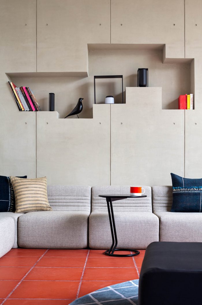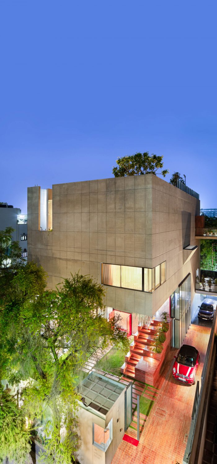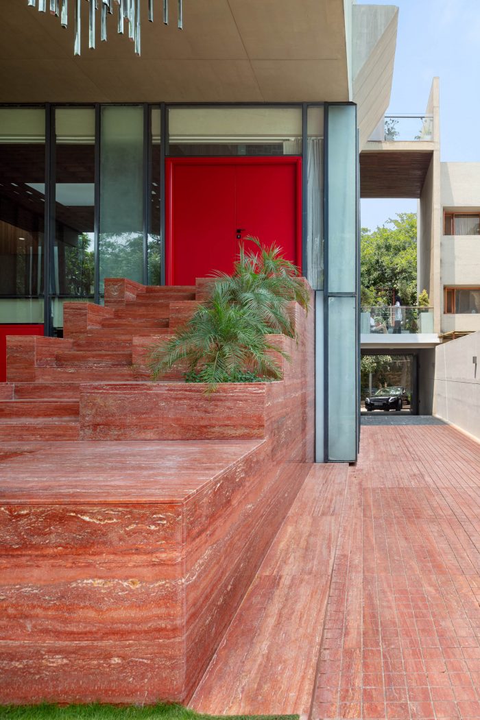 The exterior of the residence is molded to create innovative openings and skylights which allow a very strong communication between the house and the surroundings allowing ample natural light into the spaces. The exterior facade of the home creates a new attribute of solidarity and endurance in an urban context that completely stands out in comparison to the surrounding houses. The project epitomizes the convergence of natural materials like Red Travertine and Kadappa Stone in its interior palette.