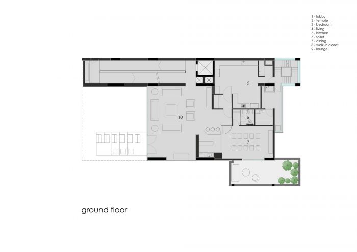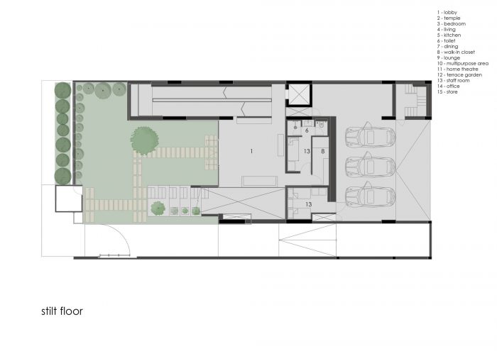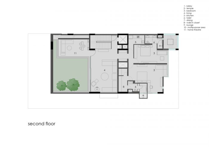 The temple is designed in a double-height space with a small aperture on the top that resembles the form of the traditional temples, reimagined in a contemporary form. The second-floor houses the guest bedrooms with minimalistic finishes and exemplary relaxing spaces with a lush terrace garden and outhouse that binds the natural and modern characteristics of the space vibrantly. The ambiance of the spaces, along with an immersive wall projection system creates new experiential spaces for the family to spend more time together.