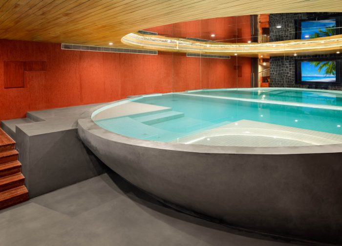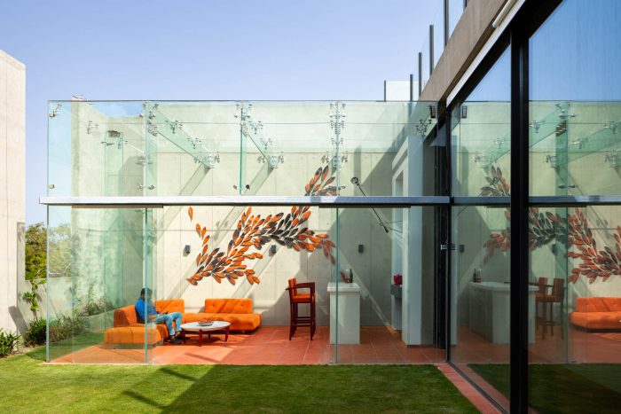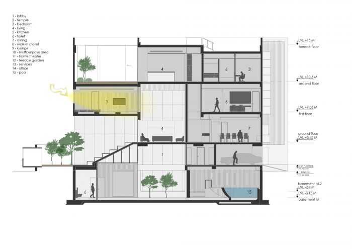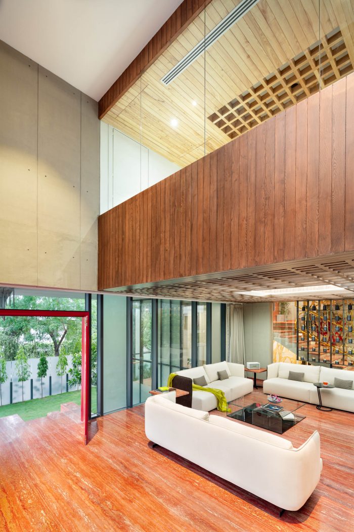 The visitors enter the ground floor through a double-height entrance. The narrative of spaces is further enhanced by the aesthetic artworks by Mukul Goyal and Vishakha. The basement floor of the house has a swimming pool along with recreational spaces in a naturally lit environment. The half-oval-shaped pool is perceived as a complete oval with the help of a full-height mirror to create an illusion of huge space. The first floor is designed as a personal space for the family. It connects the lower floors designed for visitors and staff with the upper floors that are designed for seclusion and privacy.