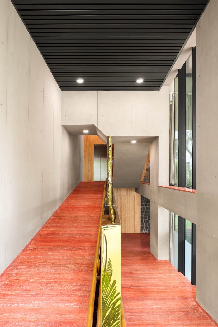 游客通过一个双高的入口进入底层。Mukul Goyal和Vishakha的美学艺术作品进一步加强了空间的叙述性。房子的地下一层有一个游泳池,以及自然采光环境下的休闲空间。在全高的镜子的帮助下,半椭圆形的游泳池被视为一个完整的椭圆形,以创造一个巨大的空间的错觉。第一层被设计为家庭的个人空间。它将为游客和工作人员设计的低层与为隐蔽和隐私设计的高层连接起来。