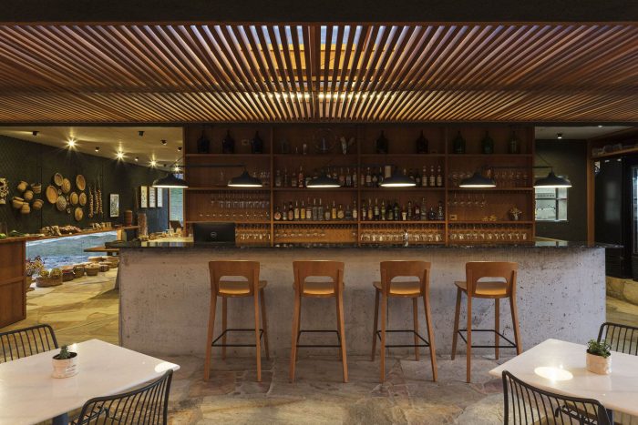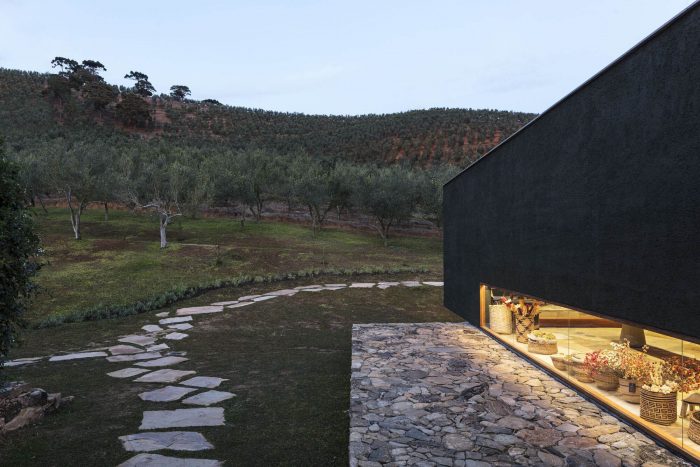 Oliq Restaurant. At this point, the implementation was already planned to take place at the front end of the Lagar where there was a large uncovered terrace overlooking the valley and the olive grove. In overlooking the valley and the olive grove. In addition to the aesthetic qualities of this location, on one side the topography favored the construction of a lower level, to be connected to the attachment and to the access to services. The architecture consists of two main volumes separated by a covered pérgola that gives access to the restaurant and the store, a lower volume where the tasting room is located, and a semi-buried basement, where we locate the changing rooms, warehouses, cold chamber, and kitchen support.