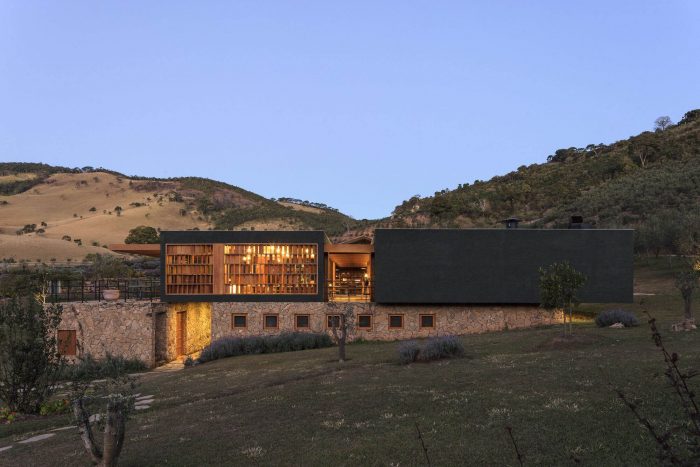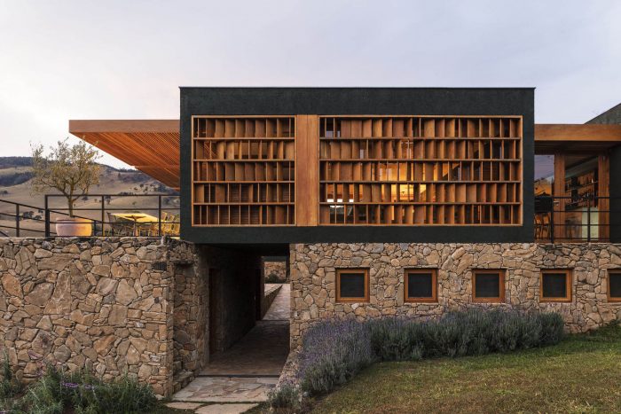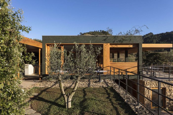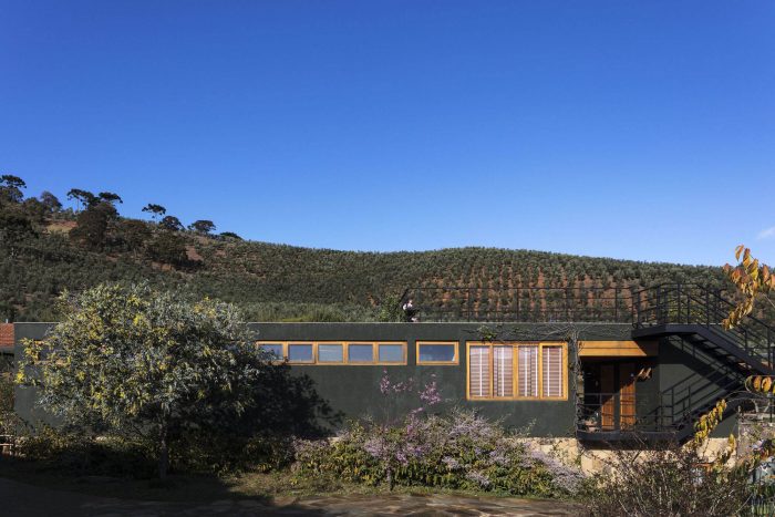 While the lower part was covered with local stones, the upper volumes were rustically plastered and painted with the same dark green used in the Lagar.