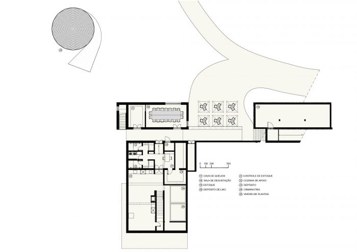 Taking advantage of the uneven terrain and the thermal advantages of a semi-buried construction, we proposed a subsoil for storing oil. The attachment is connected to the Lagar by a wooden pérgola covered with glass.