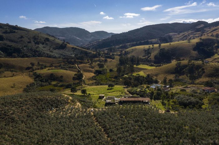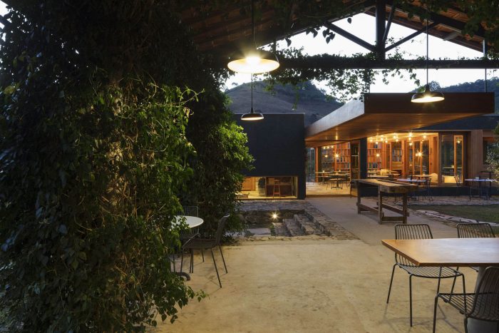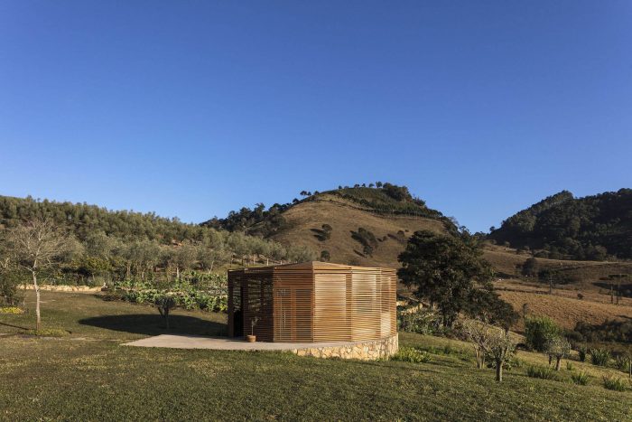 With a functional character and referring to other services building that already existed on the farm (stable and material deposit), formed by a gabled roof, with gutters and gutters painted in bright colors, we explored in this Project the large extension of the roof, resulting from the linear distribution of the program. Underneath it is a wooden box that isolates some functions, such as the extraction area, filling the office, storage and bathroom.