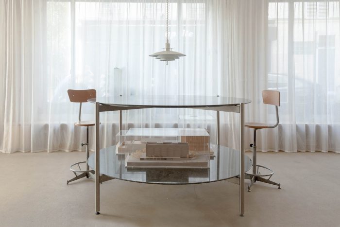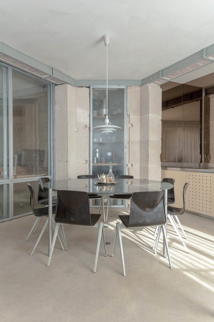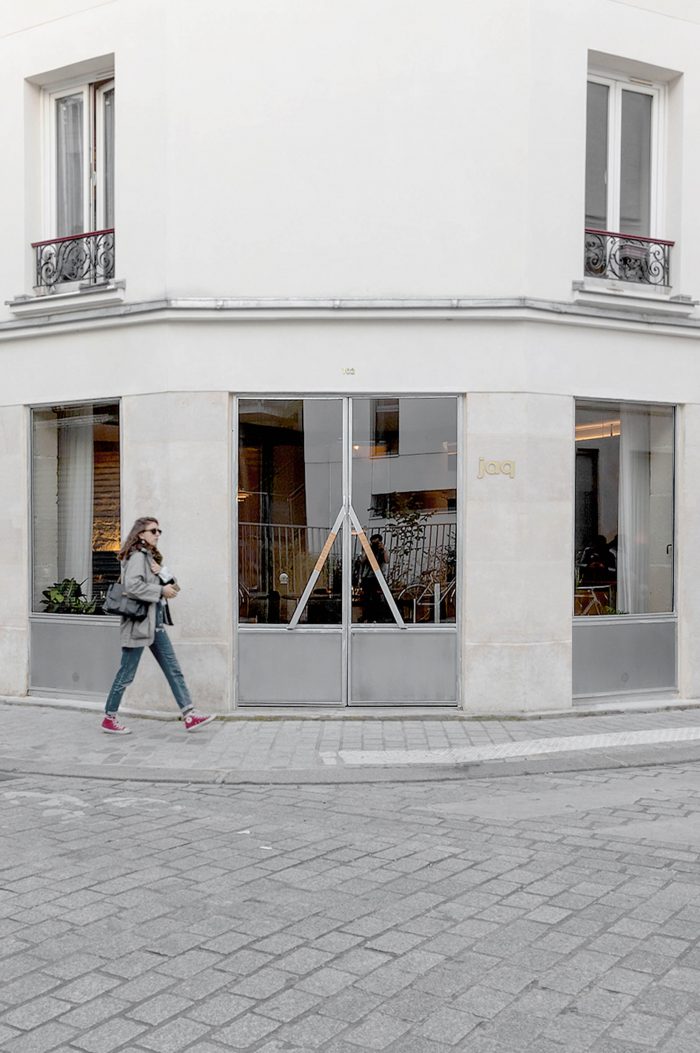 The facade has been completely reopened onto the street, windows and doors were treated in galvanized. Most of the furniture, granite tables, and birch desks were designed for the project.