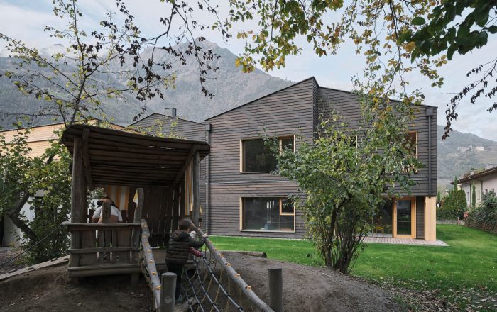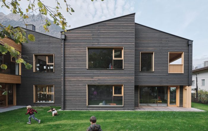Feld72 has expanded a kindergarten in Lagundo, above Merano in South Tyrol, Italy. The extension of the kindergarten was designed to continue the dialog between flat and pitched roofs of the existing with a two-story gable-roofed building and a two-story flat-roofed structure.