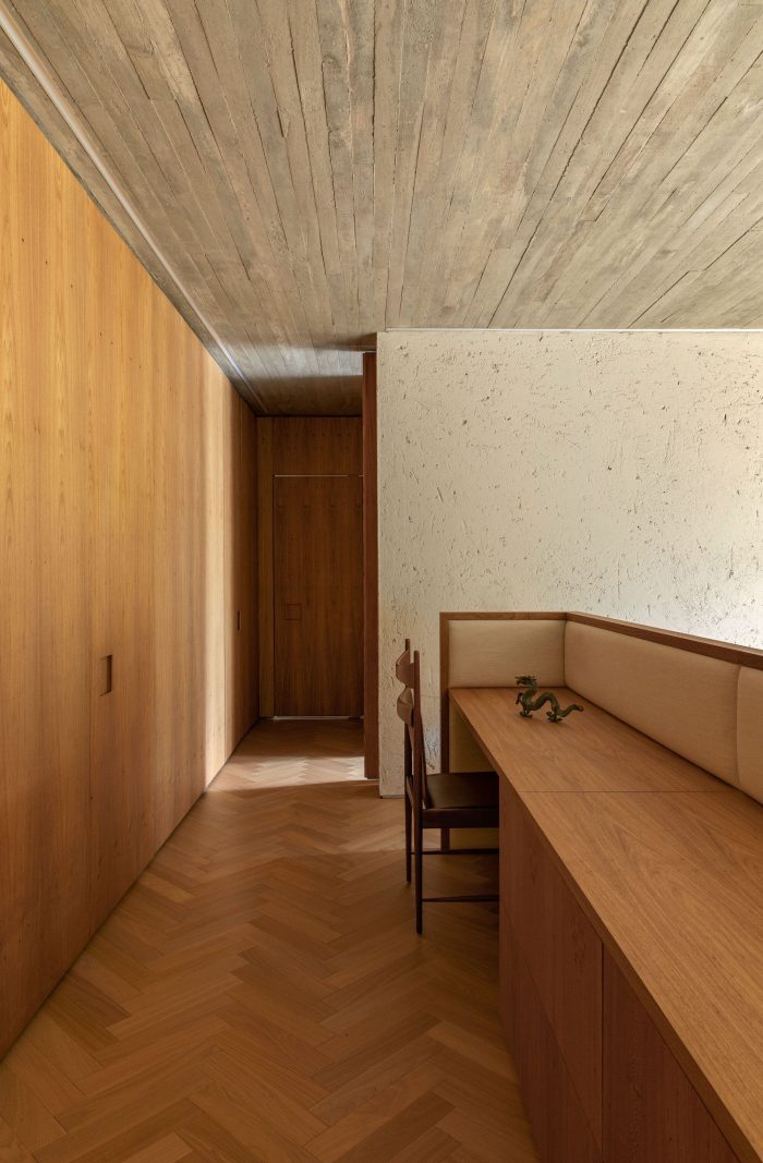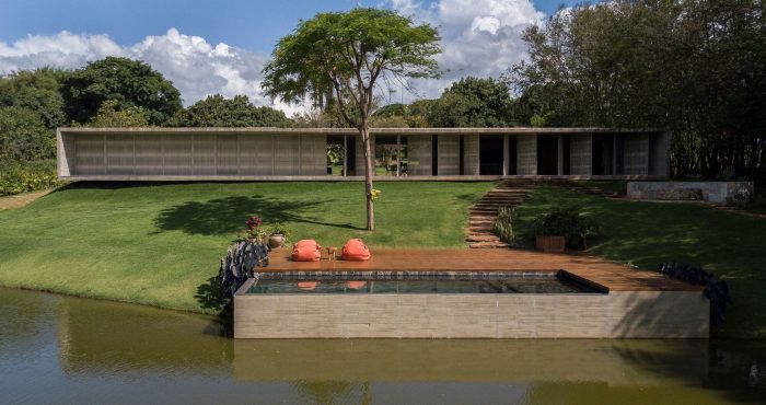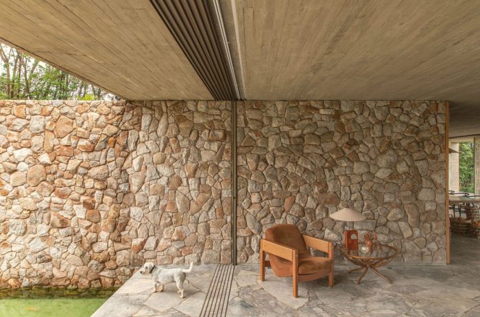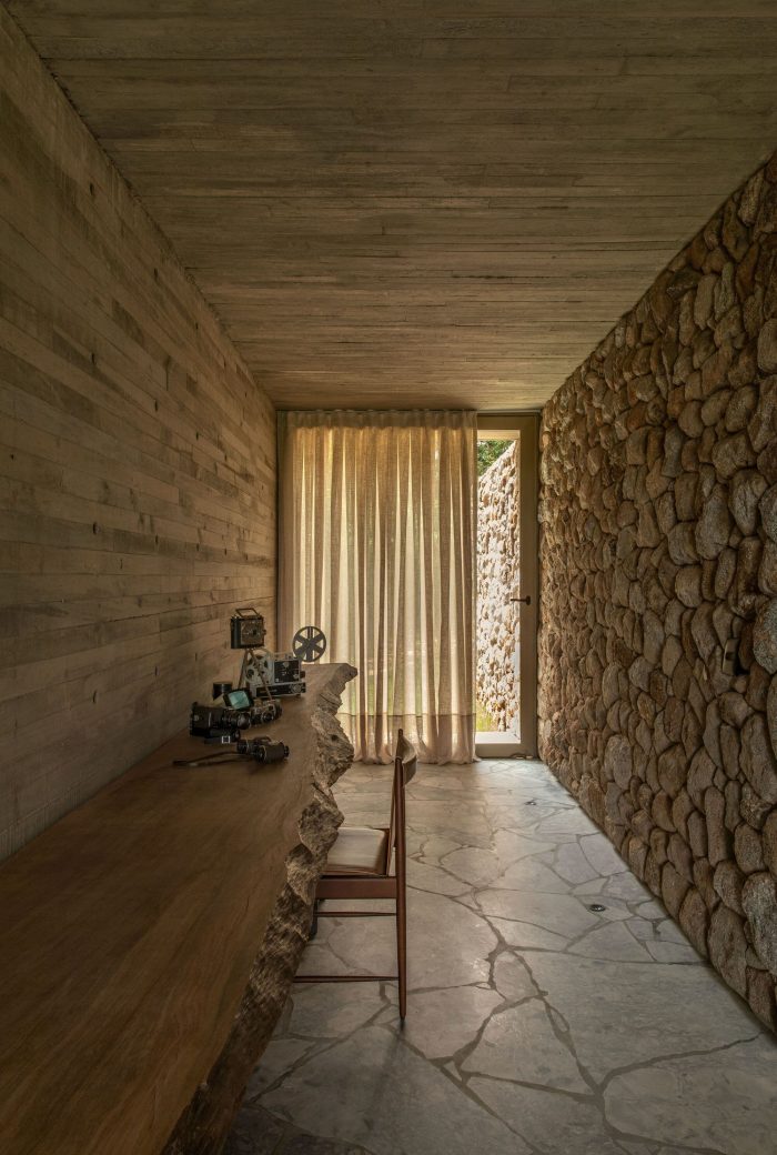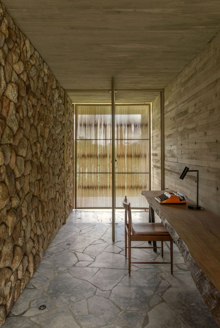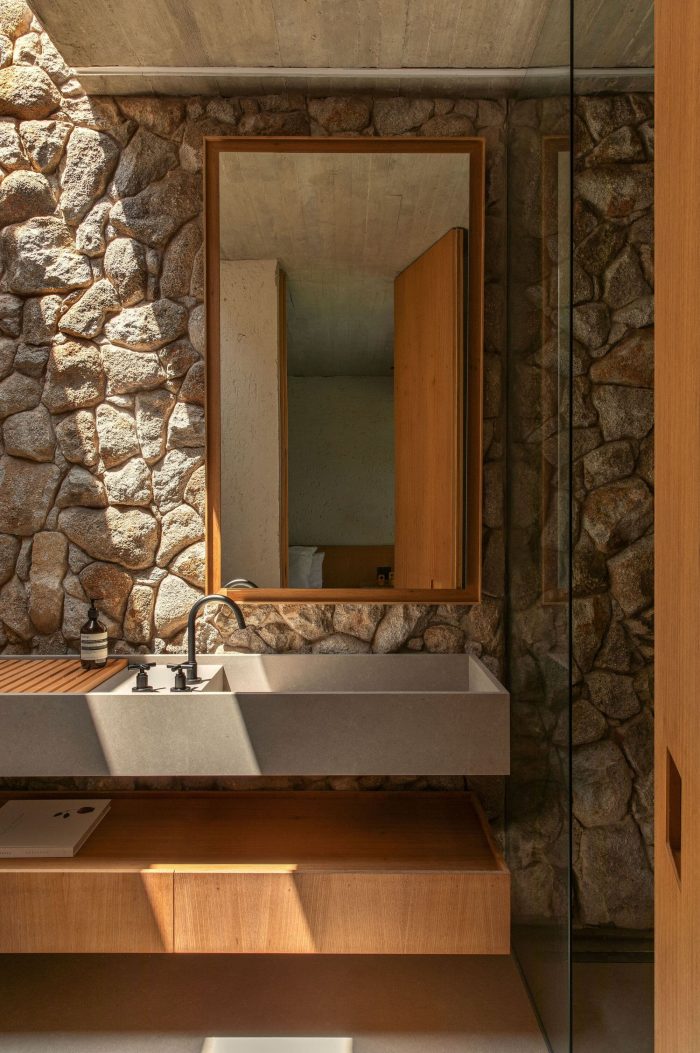 The entrance to the house takes place on the opposite side, there you can see two more volumes covered in stone and both appear to be inserted within the concrete block, one on each side. Between them, a reflecting pool with a walkway invites you to access the house. These stone volumes house different functions: one houses the two suites and the private garden of the master suite, and the other houses the garage, laundry room, toilet, wine cellar, and kitchen.