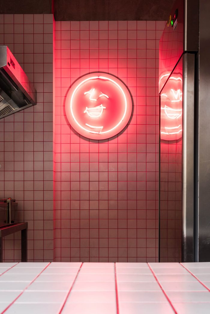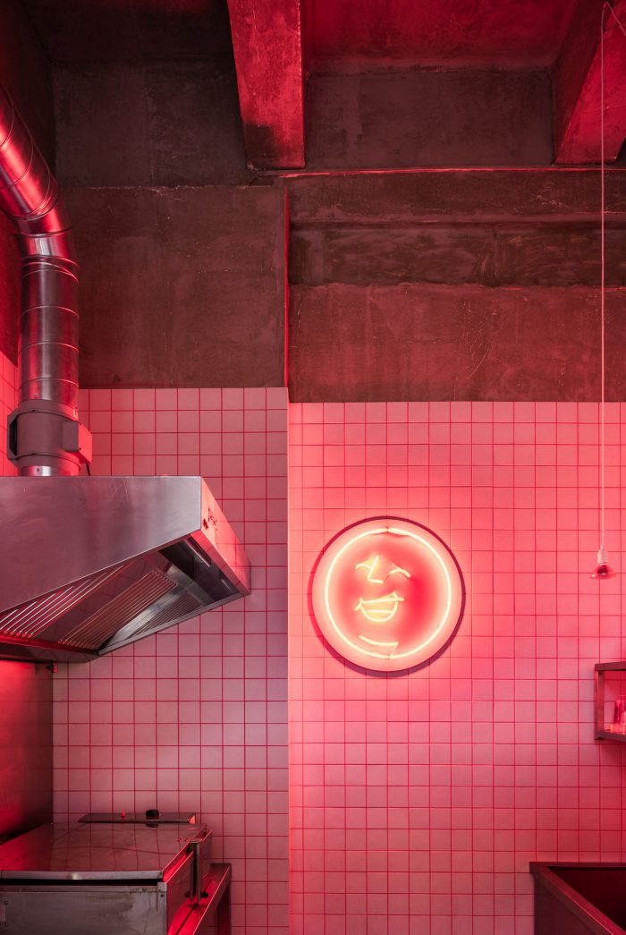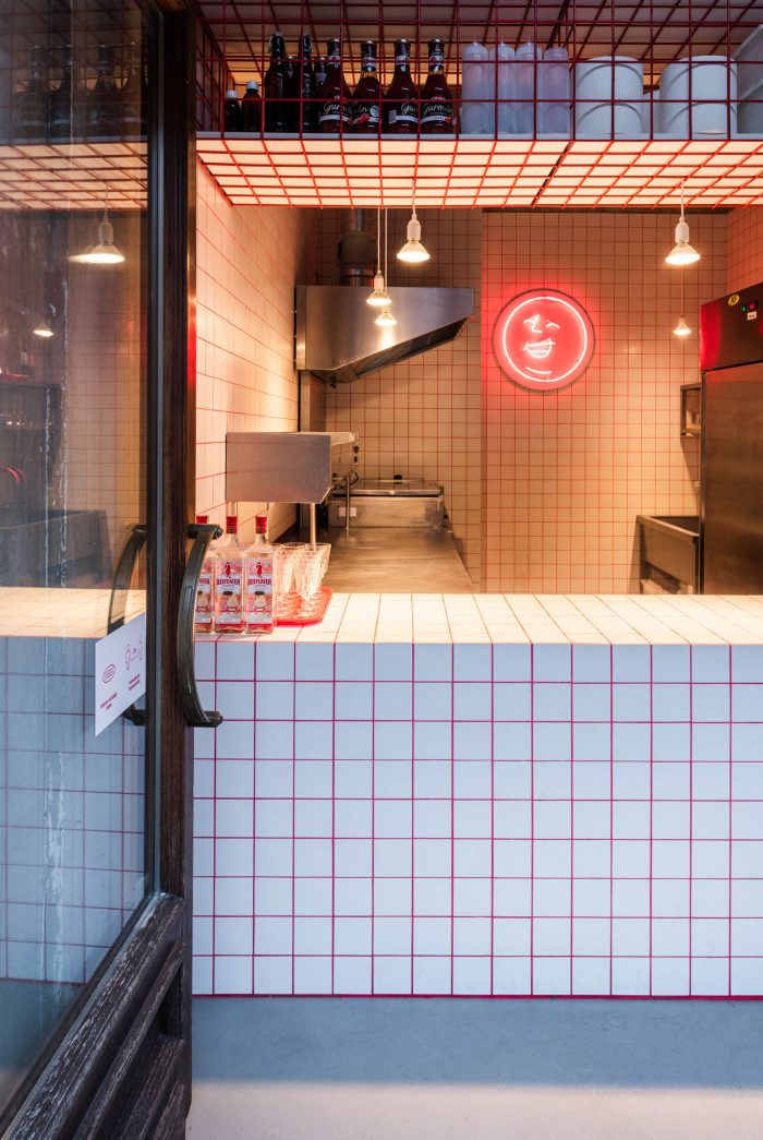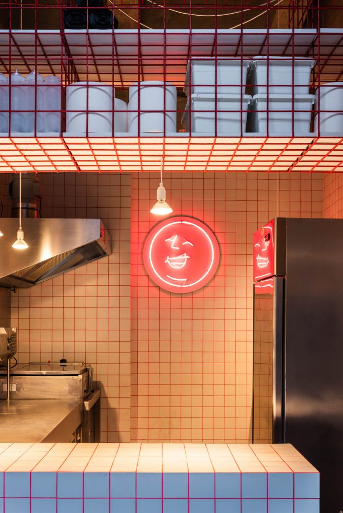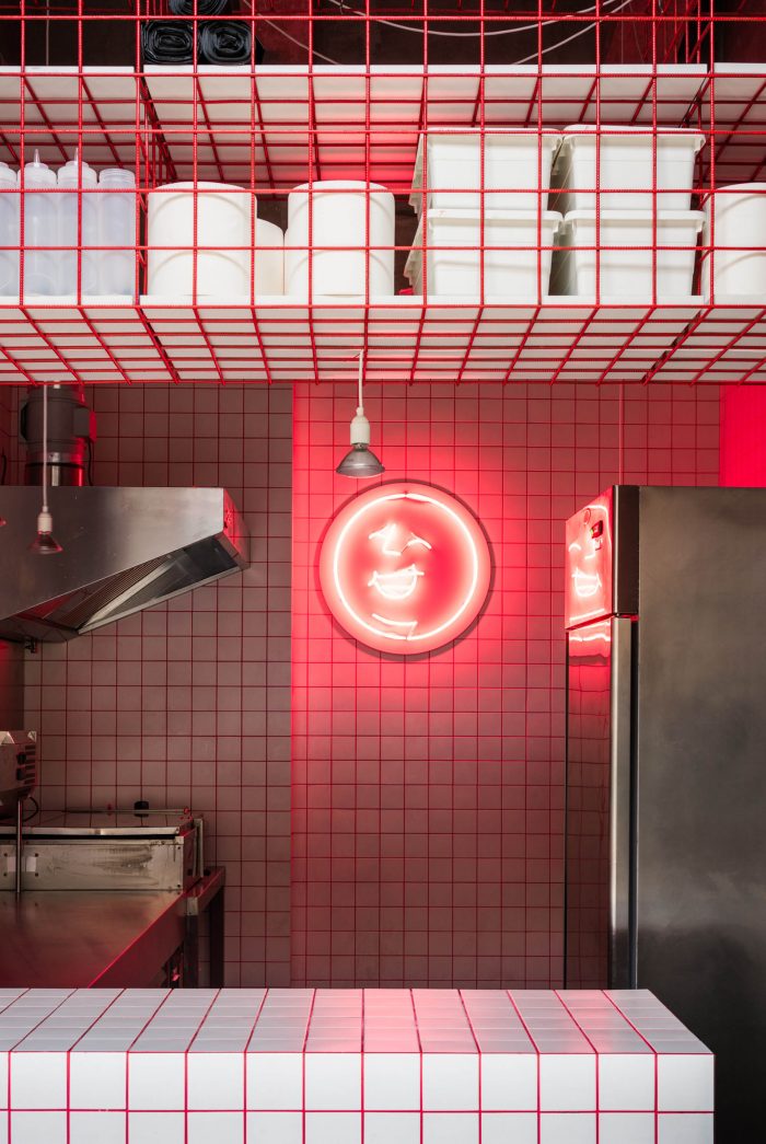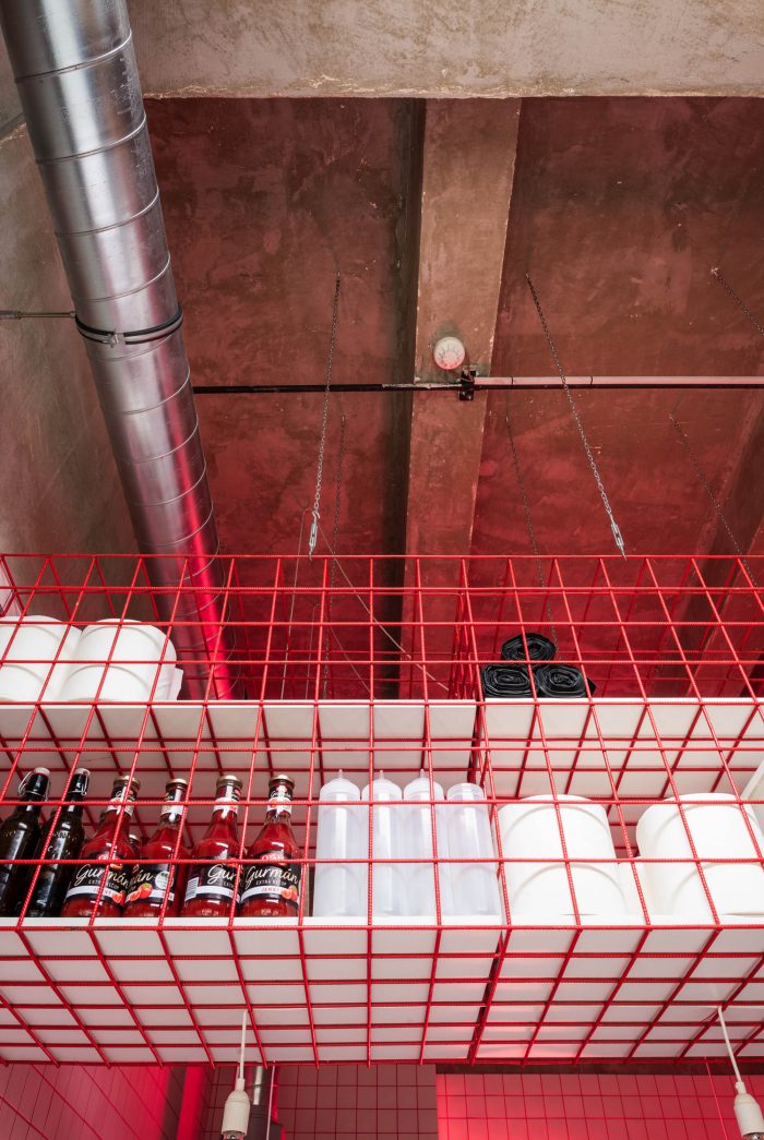 Although space is only 12 sqm, it fits all the necessary equipment. Our approach was to create a visually simple but strong design concept based on a 10 x 10 square grid. We inserted a functional box made of white tiles, steel bars, and stainless steel in the rough cement finished unit. The only color we used is red, which creates an accent and is well connected with the visual identity.