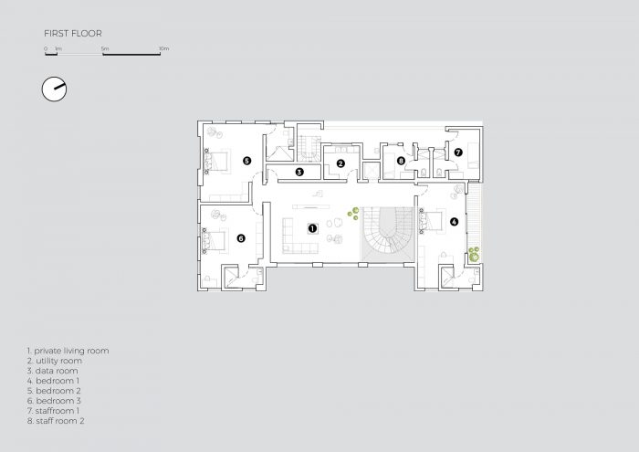 当你垂直向上移动时,房子的隐私性也会层层增加,这与传统约鲁巴家庭环境的文化要求相似,对多代人的生活至关重要。为了满足房屋某些区域对隐私和独立生活空间的需求,主卧室套房还纳入了一个58平方米的步入式衣柜,并有两个天窗将自然光投射到空间中。另一个基本特征是贯穿整个建筑的双螺旋楼梯。