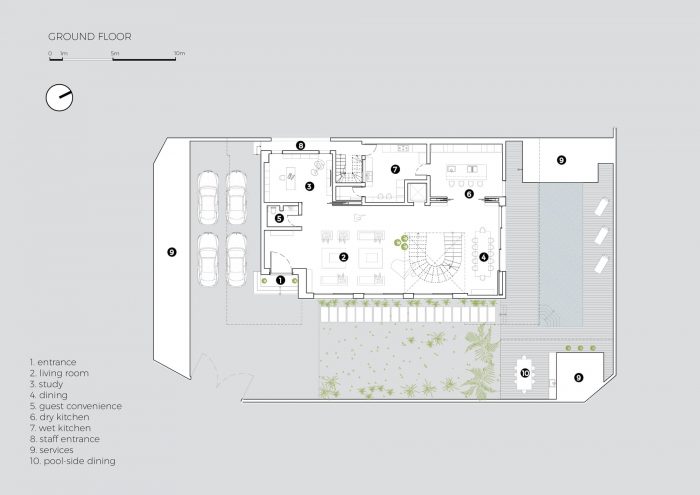 客户的要求是在三分之二的标准地块上设计一个有五间套房的智能可持续发展意识的住宅,有两个客厅、一个书房、一个游泳池、支持服务和娱乐的场地。该地块向东开放,因此,该住宅的设计方向是所有房间都能接受朝东的自然光,这对住宅的功能至关重要。自然光的温和扩散,加上高高的天花板和高大的窗户,使空间感觉更大,更通风,更有活力。开放式的生活,视线贯穿于底层的程序化空间,也使家庭有一个自由流动的、开放的、舒适的空间来召集和互动,轻松地流向室外的生活空间和游泳池,使住宅的室内和室外空间无缝流动,这是拉各斯热带气候的一个重要好处。