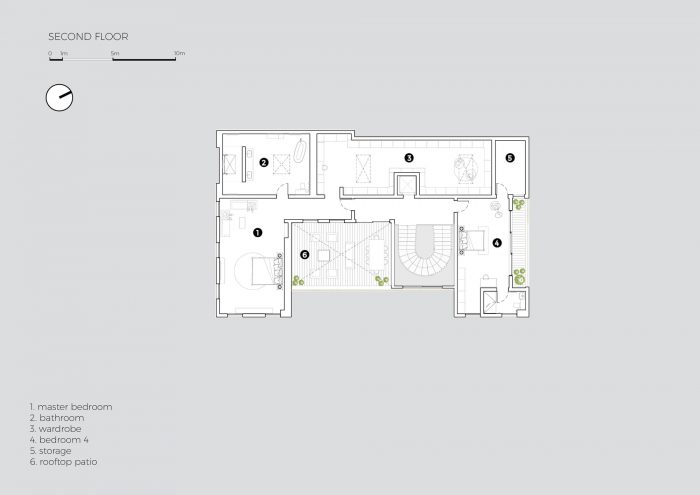 The house also has layers of increased privacy as you move vertically upwards through the property, similar to the cultural requirements of a traditional Yoruba household setting and essential to multigenerational living. In keeping with this need for privacy and separate living spaces in some regions of the house, the master bedroom suite also incorporates a 58 sqm walk-in wardrobe with two skylights that throw natural light into the space. Another essential feature is the double helical staircase that runs through the building.