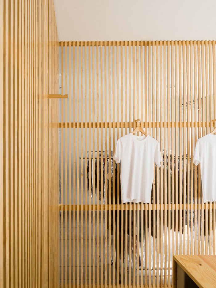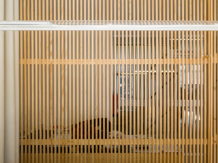 这种区域之间的分离确保了更好的服务质量,因为顾客会立即感到受到欢迎,而员工则有一个更有保留的工作区域。这个目标是通过一个板条木结构实现的,它在划分不同区域的同时也让自然光进入,因为它是一个不完全封闭或不透明的中心元素。