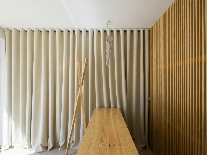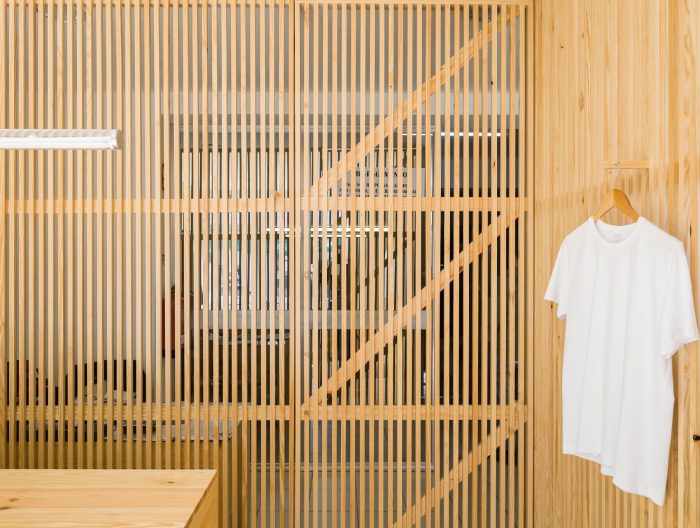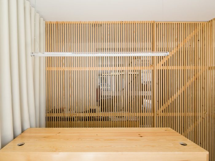 The floor plan for this space is quite simple: a waiting area and a reception desk. Nevertheless, by using wood – the main element – the space becomes lighter and more luminous, thanks to this material which creates an immediate feeling of well-being.