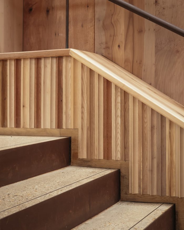 Reuse is a strong theme throughout the new pavilion. All internal joinery and furniture timber was salvaged from trees felled across the publicly owned streets and parks across London in an effort to reduce the carbon footprint of the pavilion and reuse existing waste materials. The species of trees salvaged include London plane, Poplar, Sycamore, Ash, Holm Oak, Turkey Oak, Sequoia, Horse Chestnut, and more, and add a rich variety of textures and tones to the custom-designed fitted and loose furniture. Studio Weave worked closely with local furniture maker Sebastian Cox, designing an in-built banquette with fluted timber shelving that stretches along the pavilion, reinforcing the link to the library while creating a natural visual language that is echoed by the trees outside in Friendship Gardens. Sebastian Cox also designed custom tables, chairs, and sofas for the new space, all crafted from 25 cubic meters of waste timber.