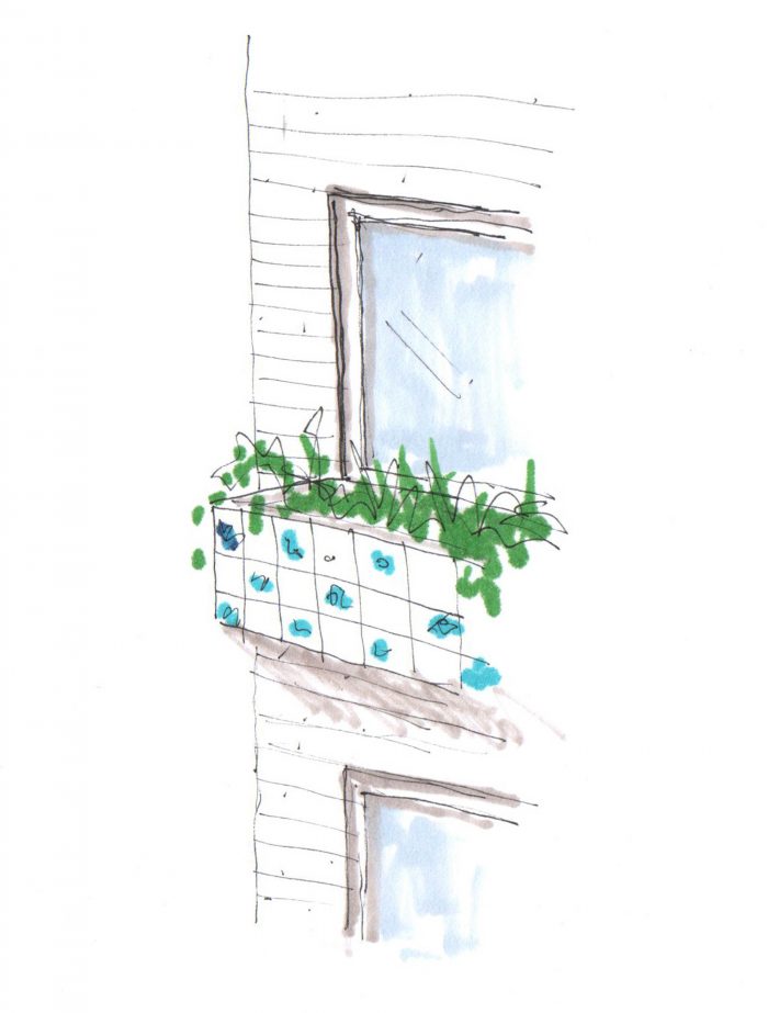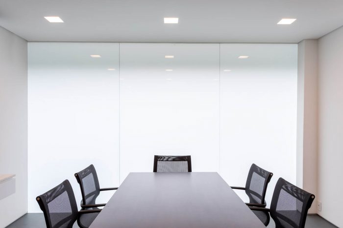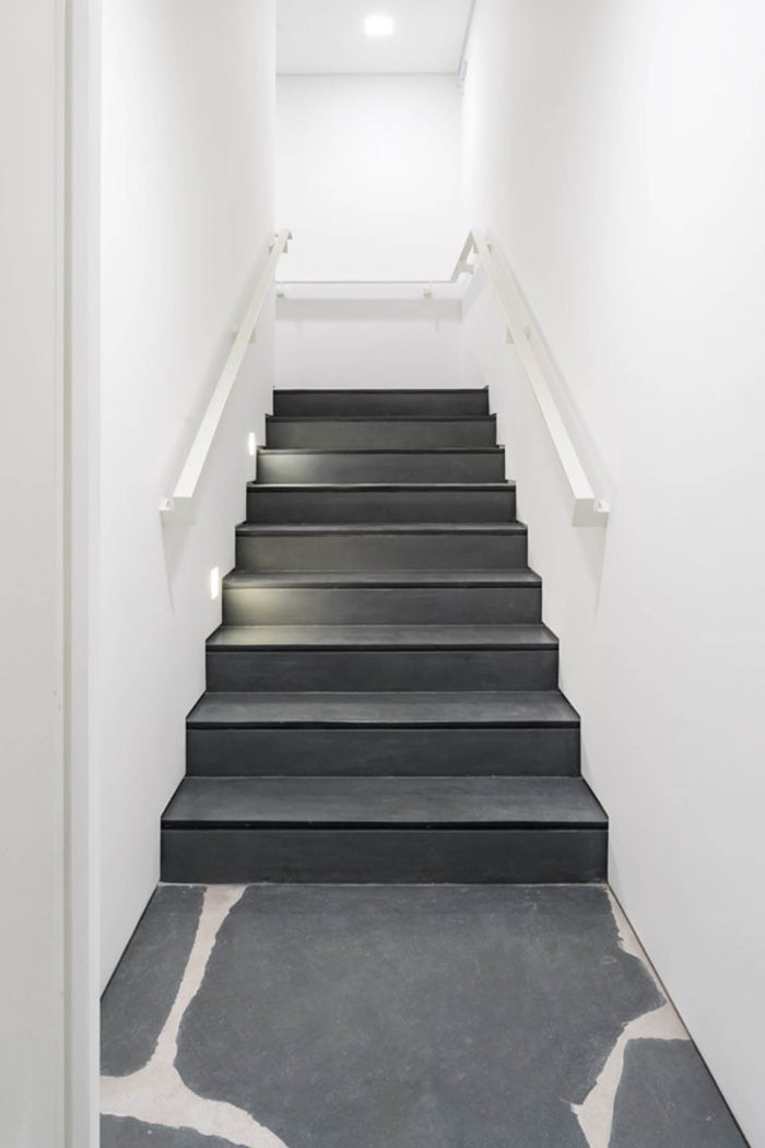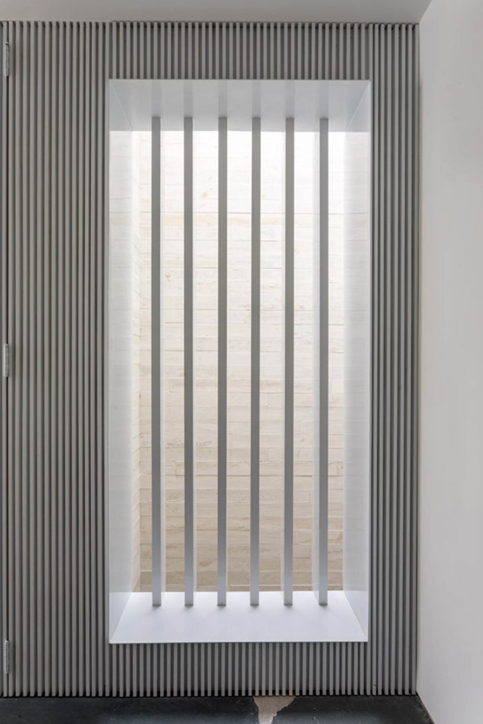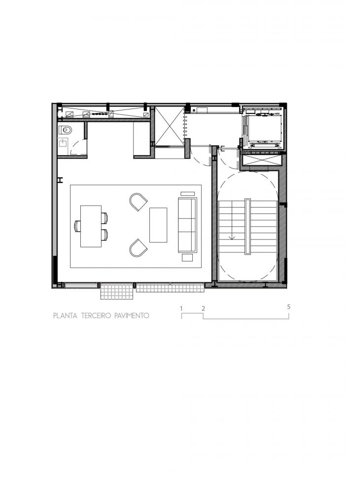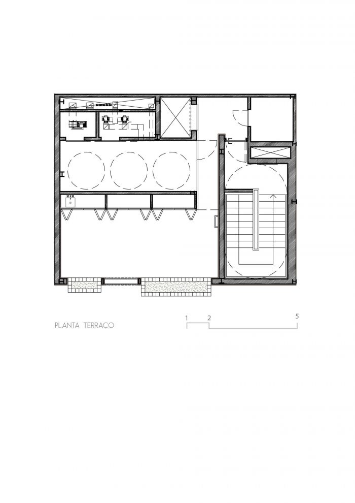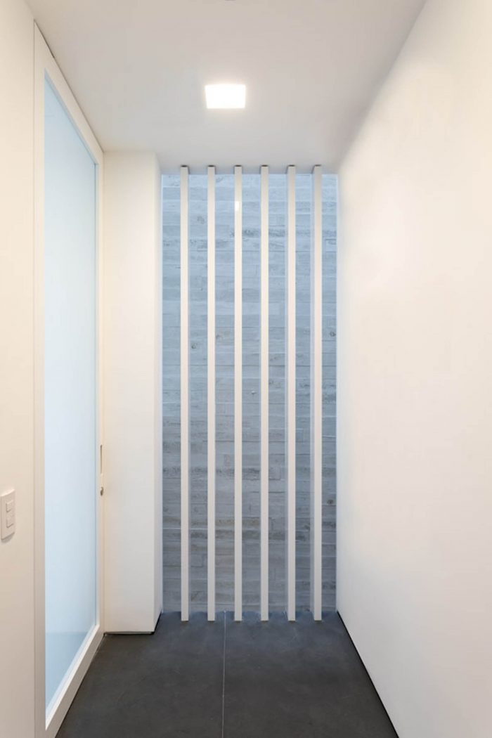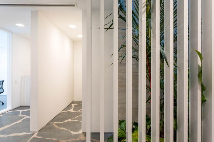 The irregular slate flooring appears again on the rooftop, which holds a solarium with a panoramic view on the city. Inside the building a little shaft brings illumination to the hallways and the offices, besides allowing cross ventilation and creates an enclosed garden on the ground floor. Its facade, strong and simple stands out from the neighbors without being overwhelming: slatted aluminum and glass, white concrete and tiled gardeners.