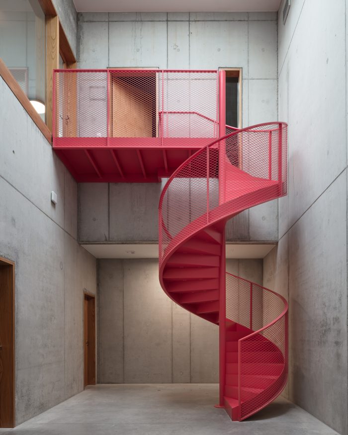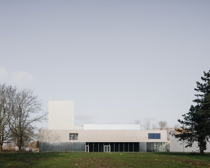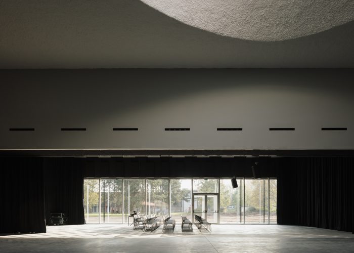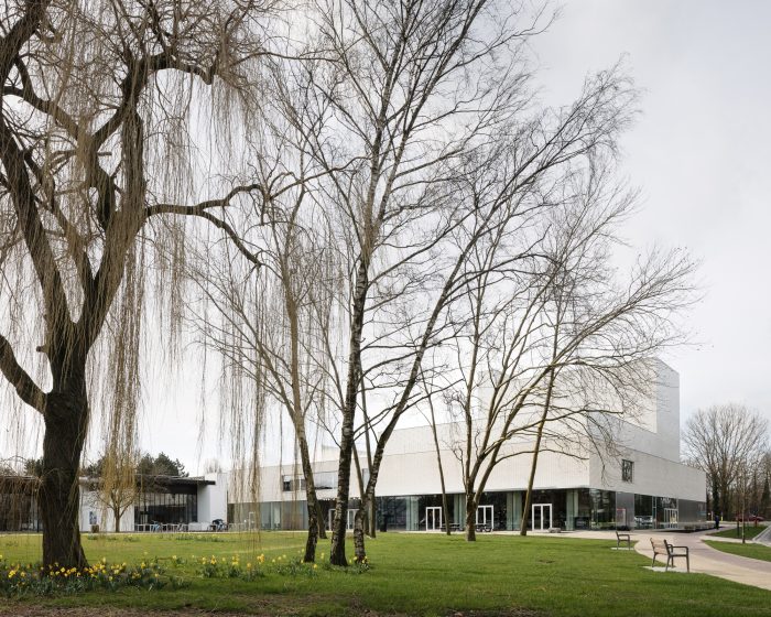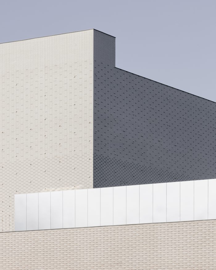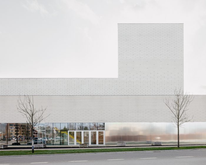 The large auditorium with its theatre tower gives the building a characteristic silhouette. The brick dress is made up of glazed and matt white stones in a pattern that is laid over the stack of volumes and, depending on the weather conditions, lights up softly or brightly. A silent gesture to Emiel Claus.