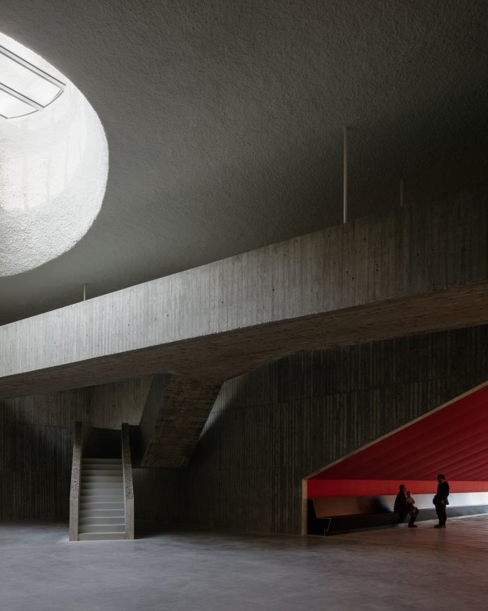 In a square floor plan, the programme components are arranged around a central foyer with a monumental skylight. The foyer can be expanded by sliding the partition wall with the multifunctional hall away. The museum is in the picture. With a café on the corner, the building activates the public domain in a place where otherwise, after the opening hours of the theatre, a pauze would arise in the urban dynamic.