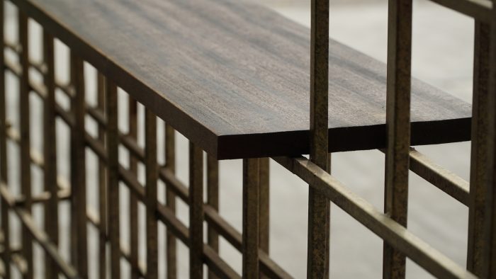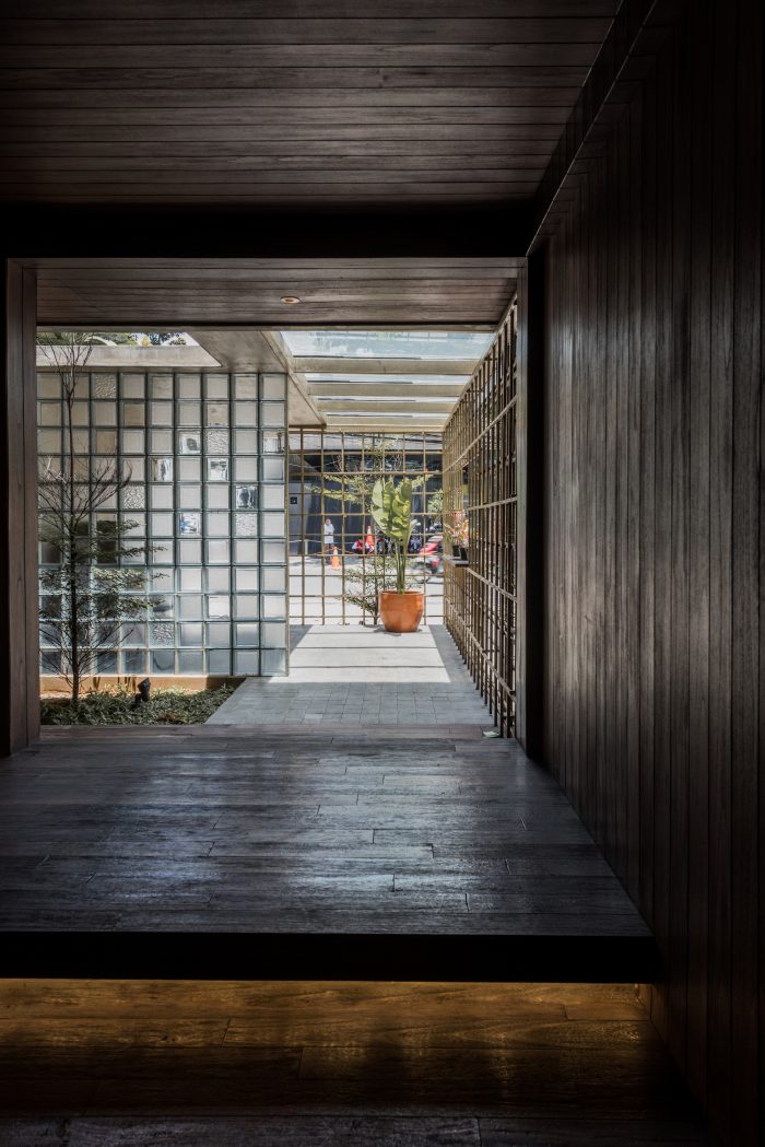 The long entrance pathway introduces the customers to Asian fusion concept, starting with a few of its elements: wood and brass tapestry. Here, the customer get a glimpse and a feel to the world inside Lei Lo. nAside from serving as a transition, the area acts as a waiting area (with wooden seats for comfort and standing tables to place coffee) and a shelter from Jakarta’s weathers, be it scorching sun or heavy rainfall. A touch of nature, long grass grows inside a row of planter pots which protects the building from the occasional rainy season floods. The plants also acts as view buffer from dining to parking area.