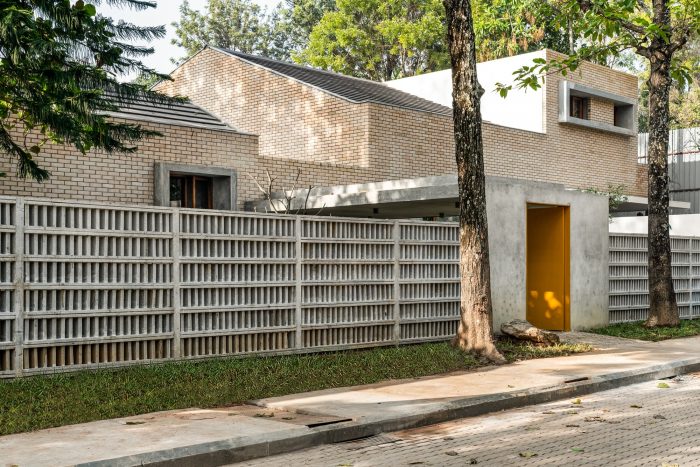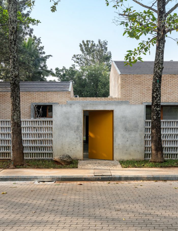 In this Bengaluru home, located in an exclusive gated community in the eastern part of the city, our first impulse was to respond to the leafy neighborhood, especially the row of majestic Kadamba fruit trees on the road that flanks its north entrance. We were keen on a vocabulary of natural materials and an architectural expression that would gently step up from the street. The 100 ft long north boundary wall takes the form of a stone Jaali, crafted entirely out of local Sadharhalli stone by skilled masons. It is a contemporary reference to the liberal use of this stone as means of securing land in rural Karnataka. The repetitive vertical pieces of stone interlock into horizontal bands with tongue and groove joinery and an absence of mortar, referencing the age-old traditional techniques of stone building in the region. A central entrance portal with a yellow door and polished cement surround punctuates the Jaali and guides one into an entrance court and then to the main door.