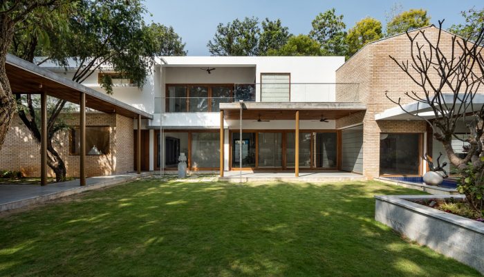 The House is clad partially with beige-colored clay bricks that reinforce certain features and provide thermal insulation as well as low maintenance. Its U-shape orientation is towards an east garden which bathes the house with gentle morning light. Spatially, the ground floor houses a double-height living room, bar and dining area, kitchen, AV room as well as two bedrooms. The public areas spill out into generous verandas that interact with the east garden. On the first floor, 2 additional bedrooms, a study as well as a family room also visually open up into the same garden. Certain areas like the living, family room, guest bedroom, and AV room have pitched sloped roofs while the rest are flat. The materiality is an interplay between brick and plastered white walls, river-finished Kota and beige marble floors, and timber-clad and polished cement ceilings.
