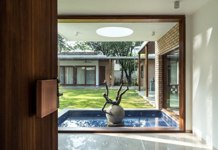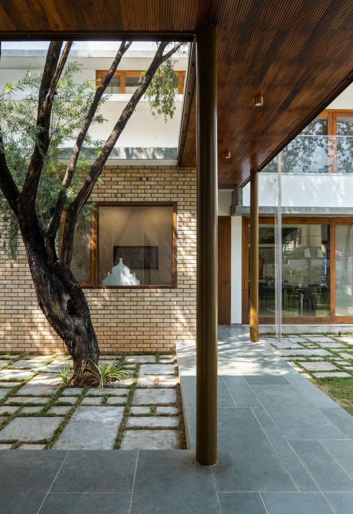 The garden is dotted with sculptures as well as existing trees, strategically placed at certain focal points. As one enters the foyer, you are greeted by a Dimpy Menon bronze sculpture precariously and energetically balancing on a stone sphere. The human sculpture seemingly floats atop a water feature and is bathed in light from a circular skylight atop it. At the southern end of the property, an imposing Willow tree is accommodated in the building design, creating a side court, and reinforcing the omnipresent green around the site.