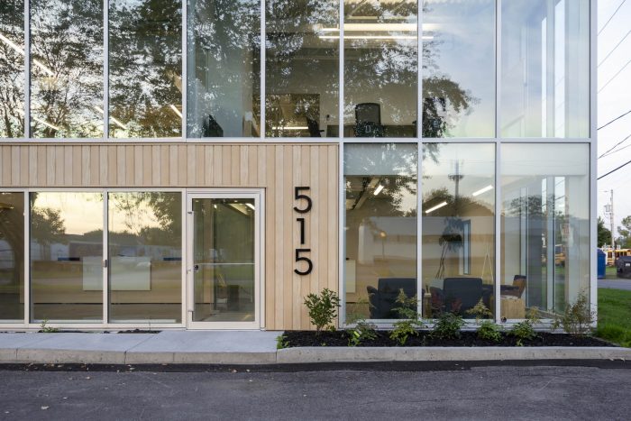 The addition of generous curtain wall sections greatly improve the workspaces and offer, from the new mezzanine, a view of the treetops bordering the plot. The new marquise make a smooth transition between the renovated section and the existing one in addition to adding to the facade an angled line which breaks the rigidity of the industrial building.