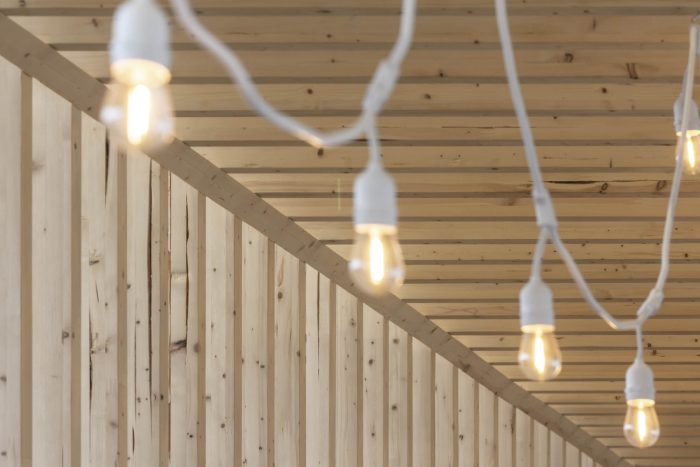 The wood-like cladding brings warmth to the facades and, inside, the juxtaposition of pine elements with the existing concrete floor and the white steel structure makes the spaces inviting.