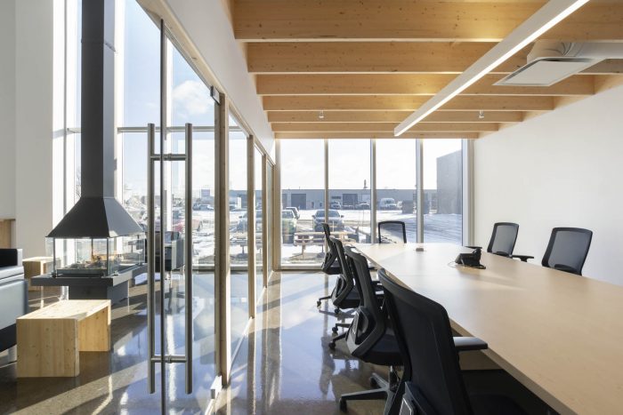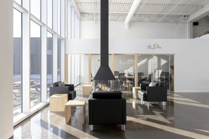 The comfort of the occupants is also improved due to the creation of flexible workspaces, like thematic meeting rooms or even the coffee space with central fireplace. Finally, like their products, custom furniture adds a playful touch to the spaces.