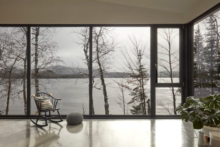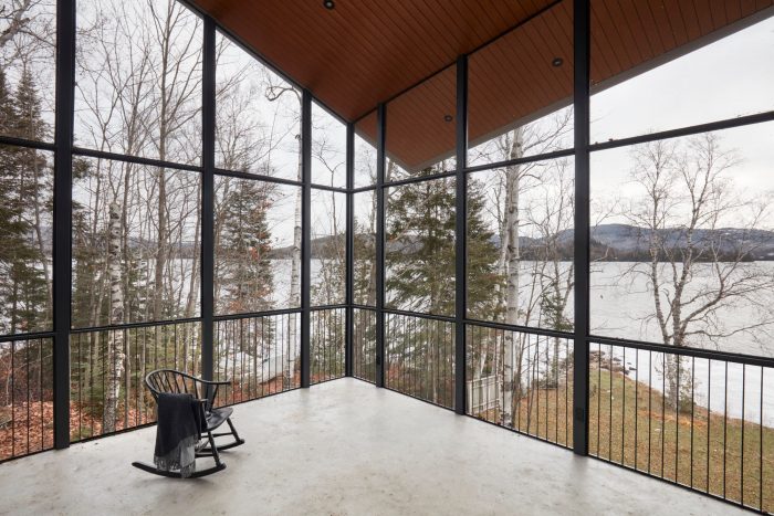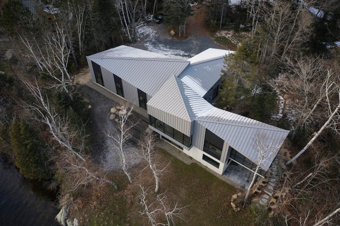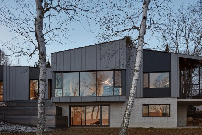 The Les Pointes residence, a new construction recently completed by Ghoche architecte, is located at the end of a peninsula on the shores of Lake Archambault, in Saint-Donat, Quebec, Canada.
