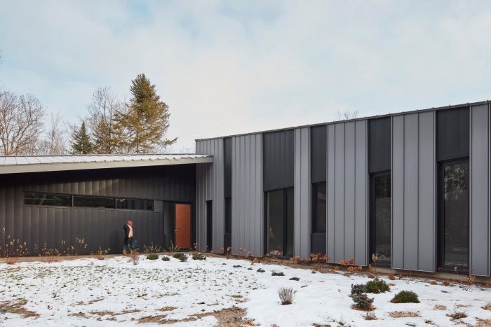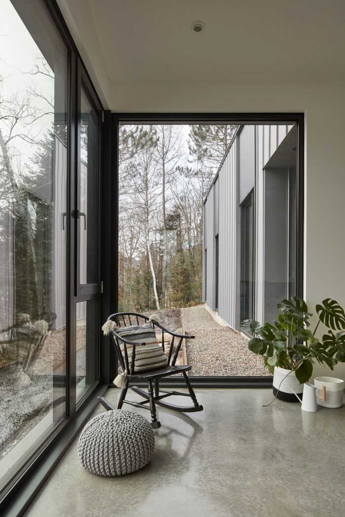 Materiality. The materials used had to be durable and require minimal maintenance. The choice of pre-finished steel as the main cladding material for walls and roofs quickly became apparent for its characteristics and aesthetic. The choice of the grey and anthracite panel coloring echoes the multiple shades of grey of the surrounding rock formations. Subtle copper accents in the soil are highlighted on the soffits of the roofs and front door, bringing warmth and brightness to the house.