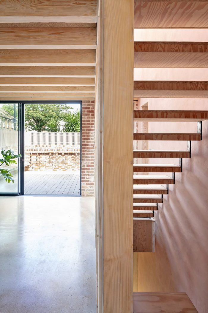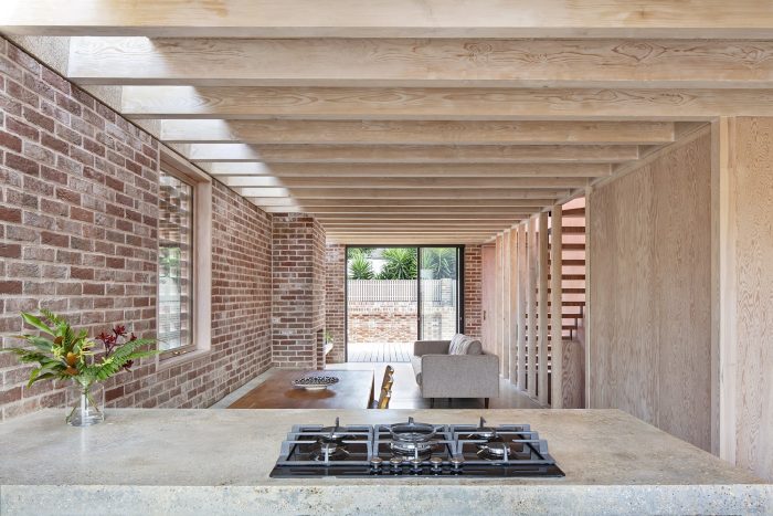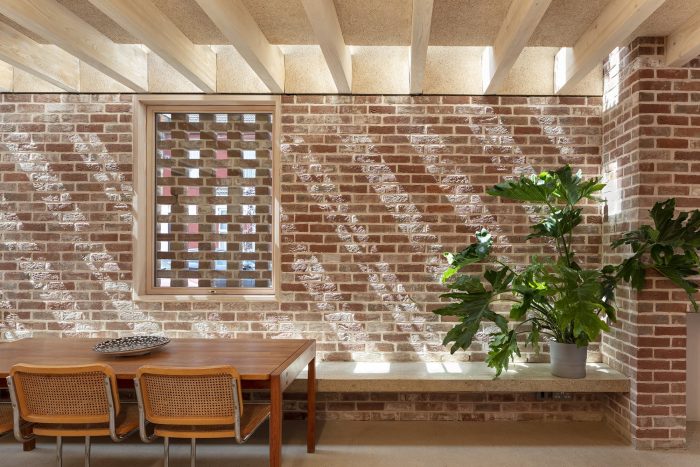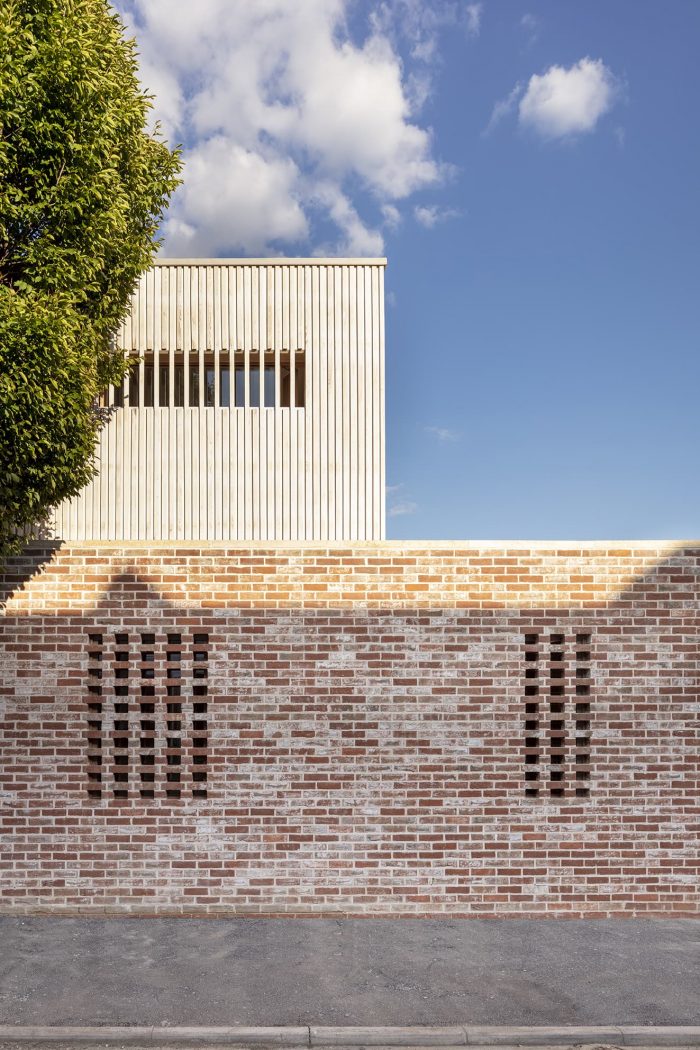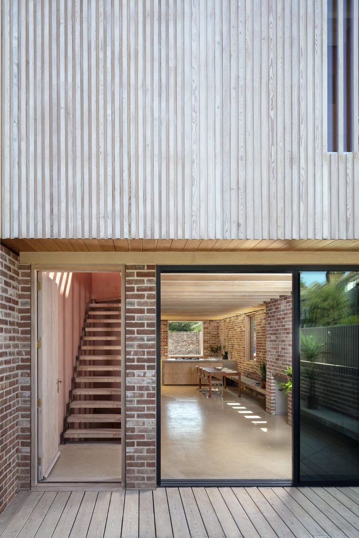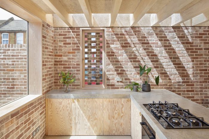 A soft, reddish brick was chosen to suit the varied context, with concrete detailing and flush white lime mortar amplifying the solid monolithic base. Siberian Larch timberwork at the first-floor level is finished in white oil, creating a unified composition that expresses the tectonic relationship between the upper and lower volumes. The forms are subtlely articulated across the site, addressing the street and corner context. A setback between the ground and the first floor creates a roof light extending along the length of the living area. Timber joists are exposed internally, modulating incoming light and creating shadows that enrich the space throughout the day. A continuous in-situ concrete bench demarcates the kitchen, dining, and living areas forming a tectonically simple and ordered space.
