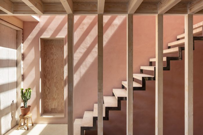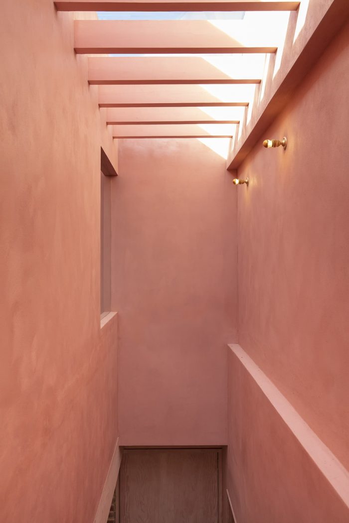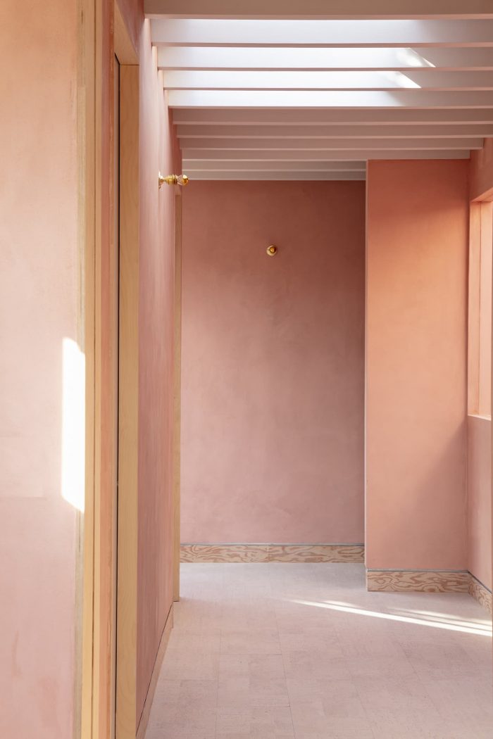 Street-facing external windows are screened for privacy, emphasizing the elemental nature of the volumes. Large glazed openings link to internal courtyards and a picture window is formed on the first floor, framing distant views of the city beyond. Internally a warm, natural palette of materials is employed - inspired in part by the client’s time spent living in Mexico – with concrete, brick, and timber softening as progress is made from public to private. A clay plaster wall links all three floors and at the basement level, different tones of clay wrap the walls and ceilings creating a feeling of enclosure and warmth. A top-lit staircase opens up to allow light to wash throughout. Through material integrity and careful detailing the building seeks to create a generosity of space and calmness that the original site did not immediately suggest was possible.