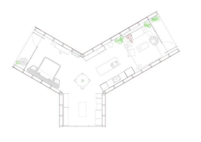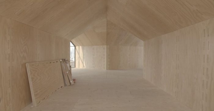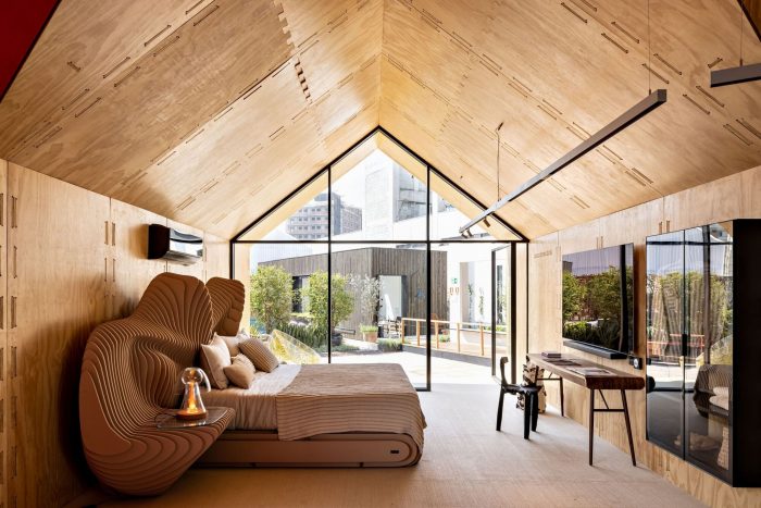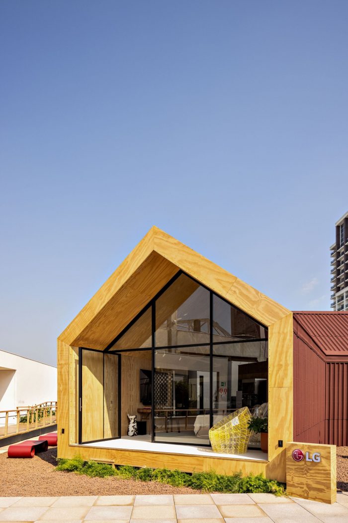 LG ThinQ House is an open-source digital fabrication project that seeks to disseminate a sustainable construction method from a global collaboration platform, the wikihouse. From the availability of the construction system, it is possible to develop a variety of forms, adaptable to different project demands. A house connected with new technologies, built from naval pine plywood sheets, machined on a CNC machine and assembled only by fittings. There are three axes of porticoes articulated by a connector module and covered with prefabricated wooden boards that assemble walls and ceiling.