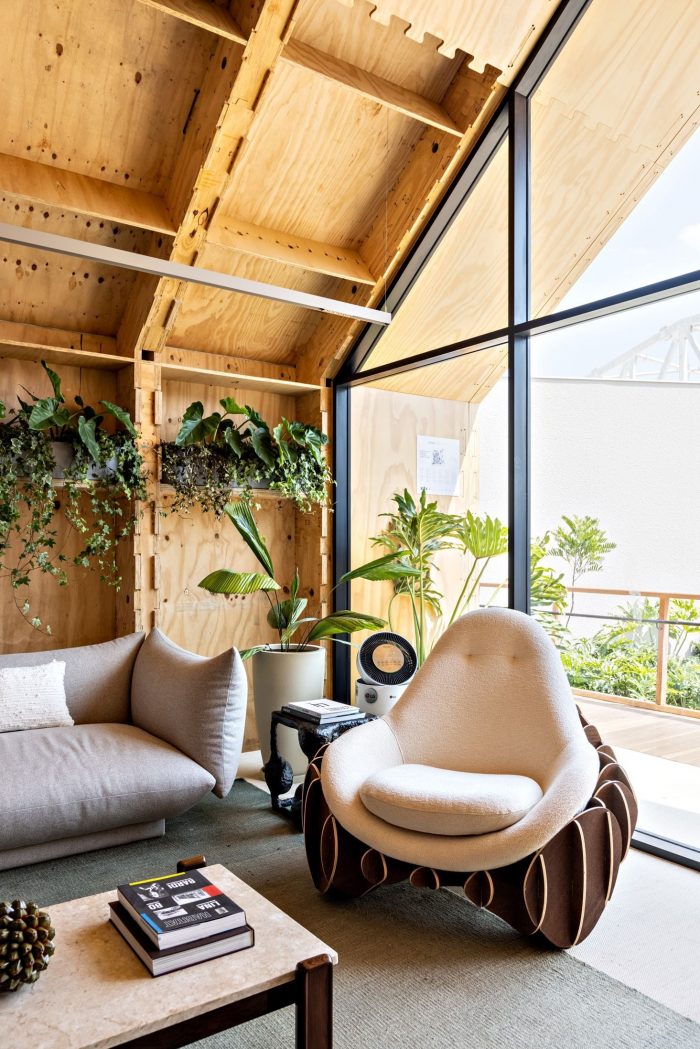 The external structure is covered with waterproofed vegetable fiber tiles, a type of light roof, made from recycled paper. Inside the House, the wooden slabs make the finish bringing comfort and elegance and are the setting for the mix of Brazilian design furniture that make up the space with works of art selected by Guto Requena, from the rich collection of Galeria Nara Roesler.