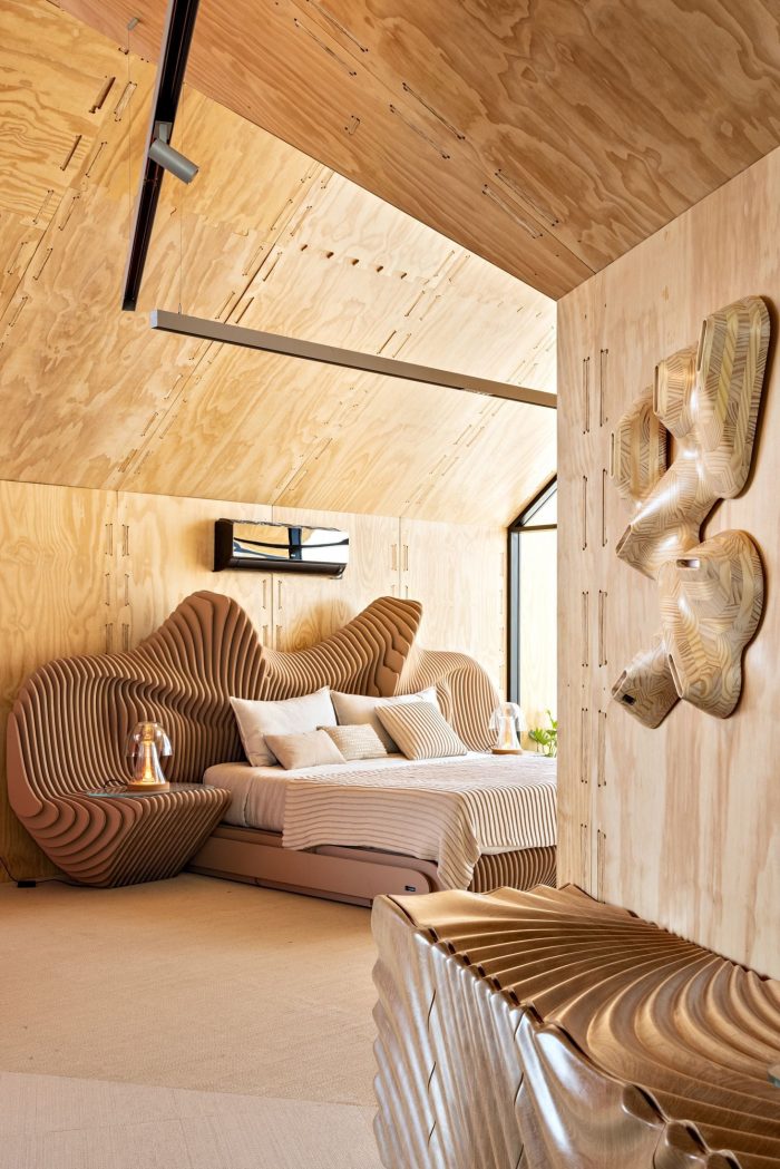 外部结构覆盖着防水的植物纤维瓦,这是一种轻型屋顶,由回收的纸张制成。在房子的内部,木板的完成带来了舒适和优雅,是巴西设计家具的组合,构成了空间,并有Guto Requena选择的艺术品,来自Galeria Nara Roesler的丰富收藏。