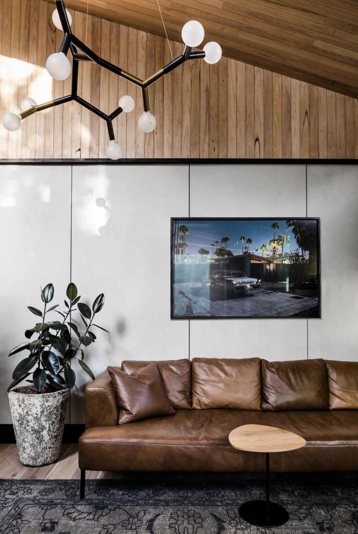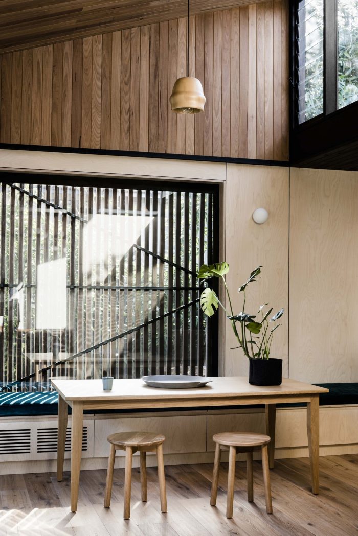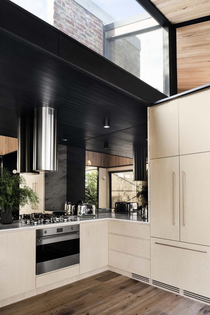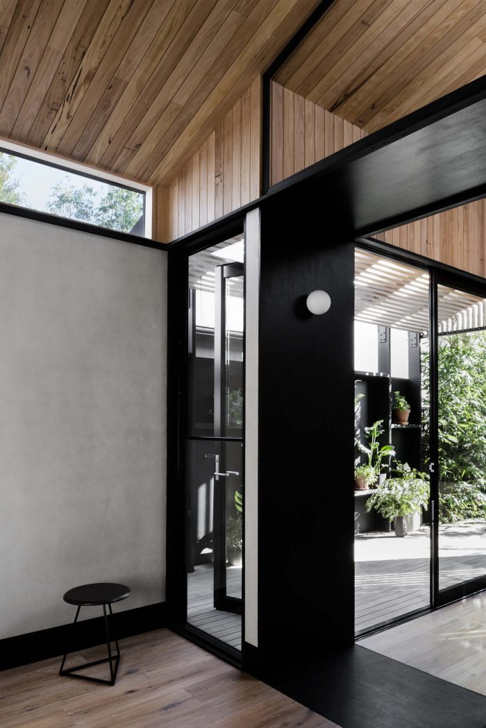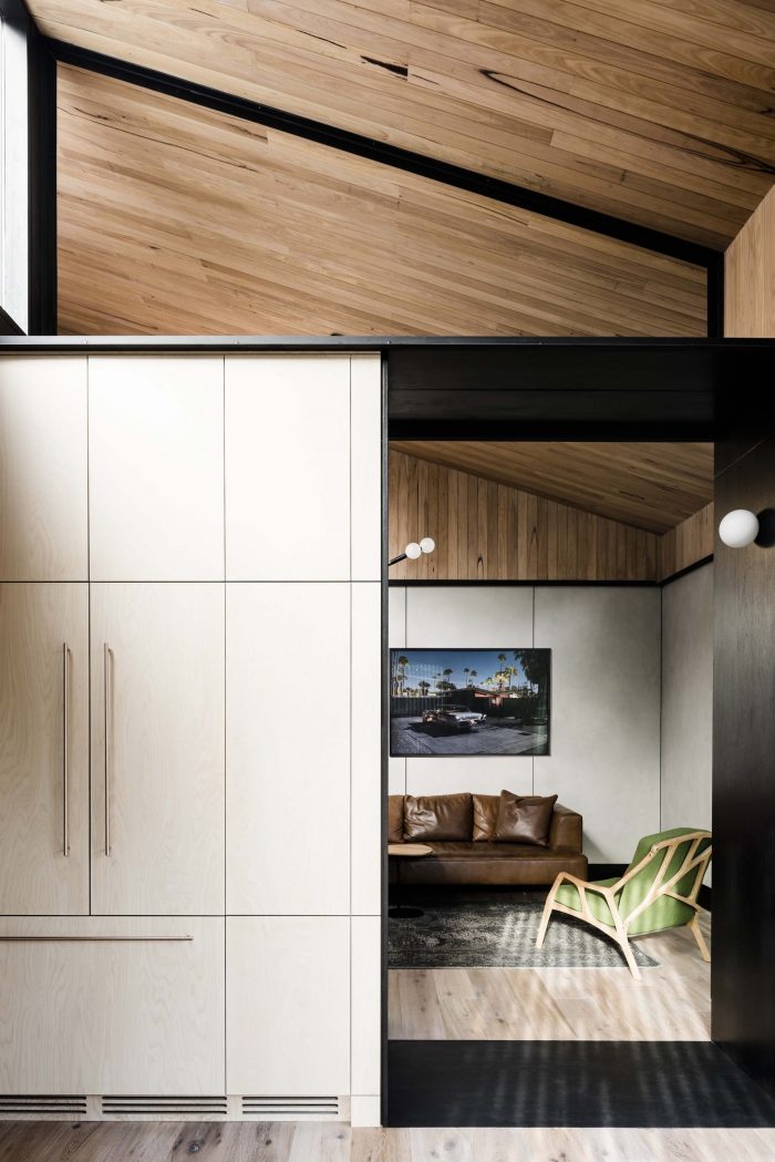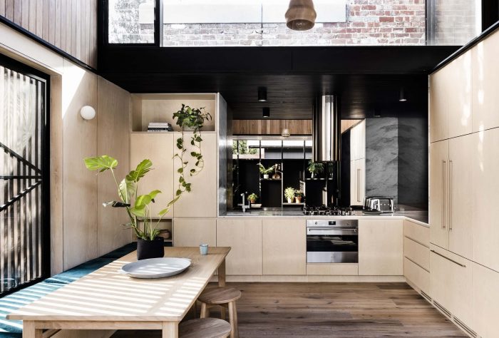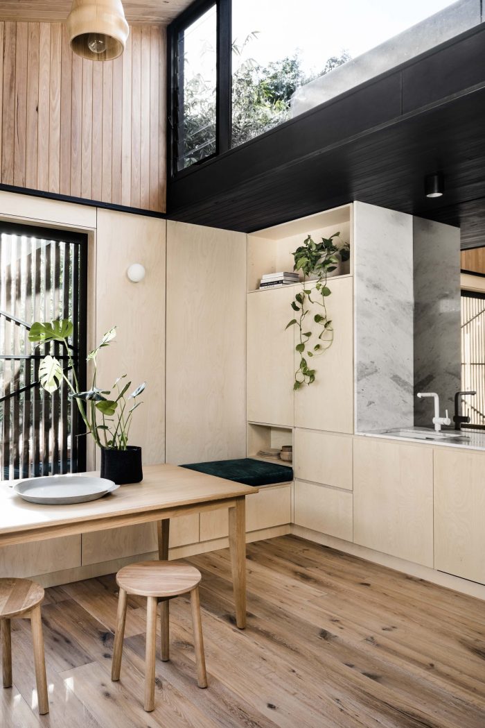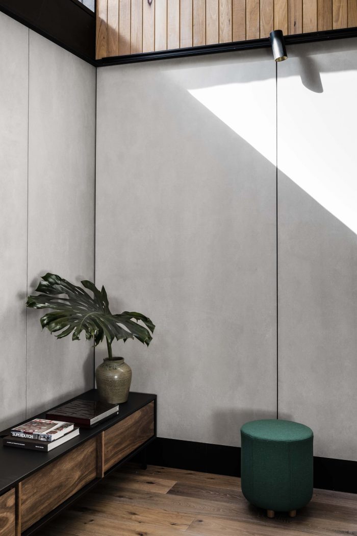 As visitors exit the darkness of the tunnel, the experience of moving into the new addition is dramatic in both texture and atmosphere. The highlight window is immediately apparent and is a key element of the light corridor house. An intimate living room, which is expressed through contrasting material change and a light portal, transitions into the kitchen. From here, there is a direct link to the outside verandah area which is surrounded by foliage, creating the sense of a private oasis in the busy urban setting of Cremorne.