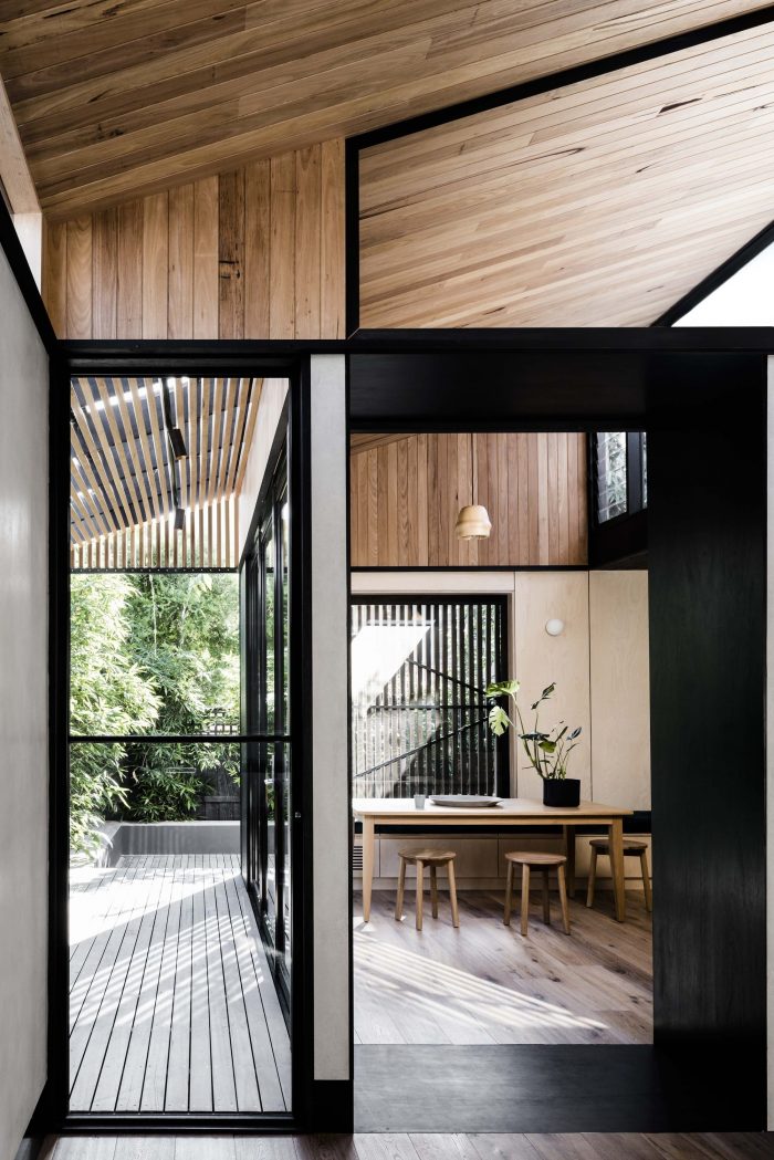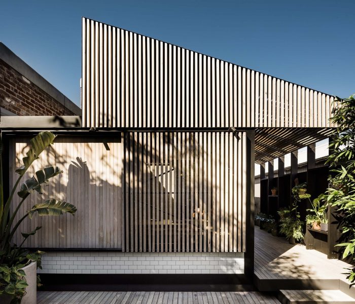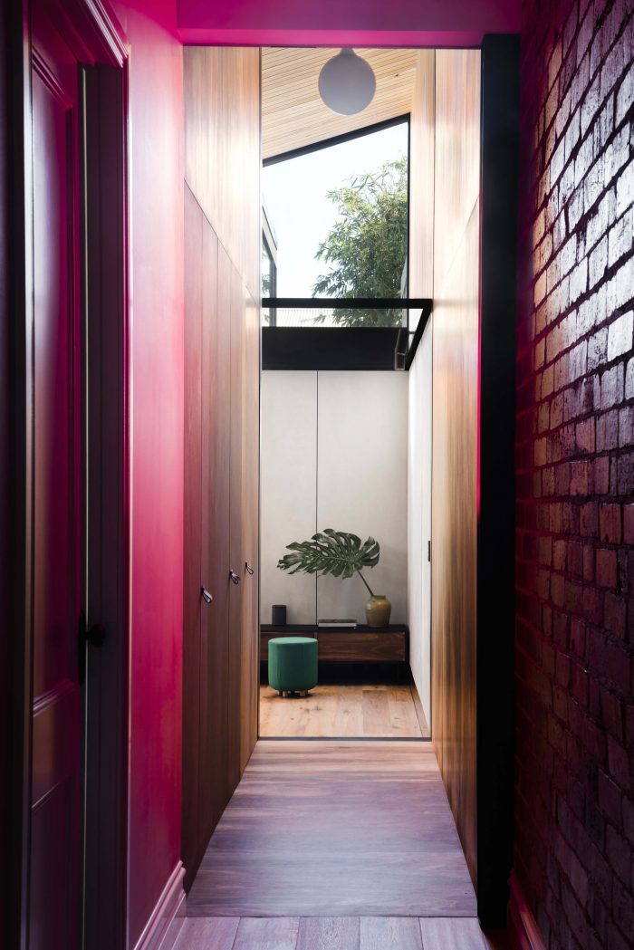 Light Corridor House is an extension which celebrates the journey through the old to the new. Upon arrival, the property presents itself as a familiar Victorian worker’s cottage. The heritage façade has been restored to its former glory, and careful consideration has been given to retaining and celebrating the period features in the original part of the property. As visitors move down the typical Victorian gun barrel corridor, they arrive at a double-height spotted gum tunnel which is the beginning of the journey from old to new. This tunnel conceals the laundry and main bathroom, creating a seamless transition.