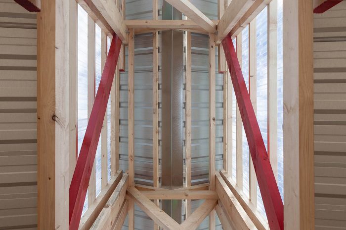 This proposed form should not be inconspicuous but, on the contrary, attractive and highly visual. Aesthetics is transferred to the structure and turns the banal static scheme of the light chimney beams into a graphic and visual pattern. We are creating the concept of a functional ornament, where the light chimney as a visual attractor also serves as a lattice girder. Thanks to this no columns are needed in its center, as the frame construction consisting of five transverse frames is reinforced perpendicularly by this lattice girder.
