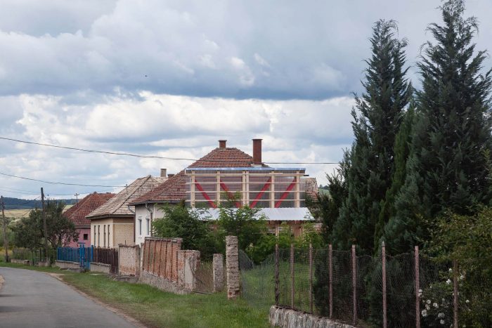 The dominant element is the chimney, which has always signalized life in the house. At the same time, in our conception, we transform it into a signal tower - a lighthouse, which marks the mainland border or civilization, and put it in the position of a billboard, like an advertisement on a local road. We transform an inseparable typological element of every house, home and give it a new meaning. Overall, we comprehensively perceive it as a point denoting a place of meeting, a place of socialization, a place of home, or a place for the community. An illuminated light signals cultural activity in the village.