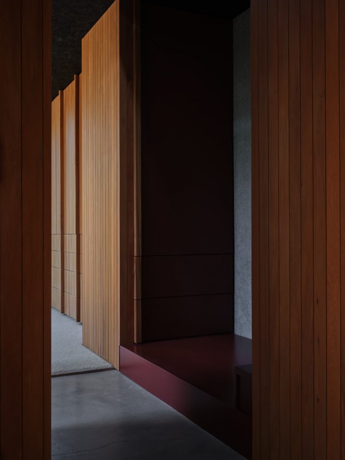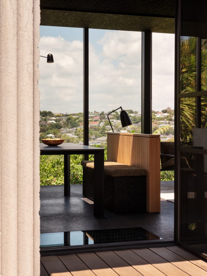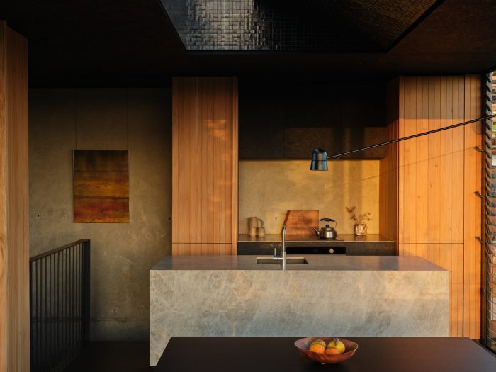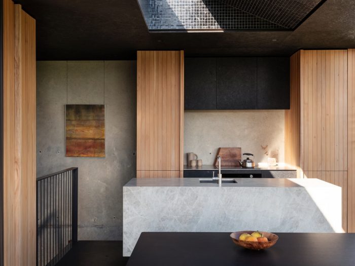Light, shadow, and materials have a symbiotic relationship here. The robust external form opens up from within, with glazing providing a connection to the wider streetscape and surrounding natural elements. Light and shadow inform an ever-changing palette. Exposed concrete forms a thermal moderator, black floors and ceilings compress and absorb light, Totara timber wall linings provide warmth and consistency for the vertical elements in the room, while the stone bench is raised on a plinth to create an anchor to the space – designed as a piece of furniture. With the primary focus of the house being away from the sun, it provided a special opportunity to consider how best to let it back in. Exploring how light can be amplified, a 4.2-meter-long 'slot' was inserted at the apex of the roof. Together with the ceiling space flaring out, this encouraged the sunlight to be directed deeper into the living spaces.