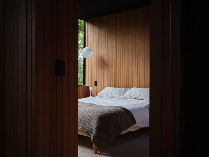 There is often a hesitancy towards intensification from older generations, who feel their surroundings will be degraded or the character of the neighborhood lost through this process. Lightly Weighted challenges this mindset and offers an insight into how we can enhance our surroundings and improve our quality of life. Lightly Weighted considers all these possibilities and demonstrates how materials, light, and scale can become highly reactive, and connected to their surroundings. The building occupies a 42m2 footprint (85m2 over 2 levels) and uses a combination of cost-efficient materials such as OSB and combines these higher quality options in spaces that we engage with on a daily basis. Locally sourced timber lines the walls, while also serving a functional purpose to conceal kitchen cabinetry, coat cupboards, wardrobes, and laundry.