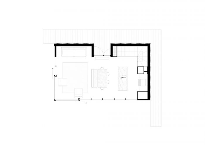 光线在特定的位置(即4.2米长的光瓢)被赞美,这使我们能够考虑如何最好地让光线重新进入。瓷砖 "勺子 "被设置成一个角度,以鼓励冬季的低度阳光,而在夏季,狭长的空间意味着生活空间不会被全天的阳光所淹没。凹槽混凝土墙将房子固定在两边,提供了一个保护性的面纱,使其免受邻近邻居的影响,而另外两面墙则完全是玻璃的,这就特别注重更广阔的方面和周围环境。房子的一角在夏季开放,形成一个有盖但暴露的休息区。