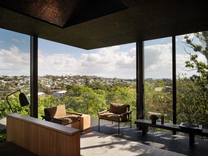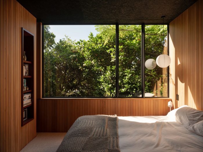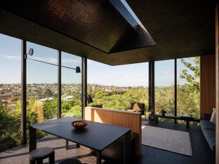 Perched looking out from its elevated position, the modest two-bedroom home feels removed and transportive, despite being embedded amongst residences in the Auckland suburb of Grey Lynn. While inner-city living has its multitude of benefits, there exists an undeniably compromising closeness between residences, where feeling separated is not always a given. By creating a protective shell of sorts, Lightly Weighted feels both removed and private, where outward views connect to nature as a priority. The small 85-square-meter home sits on an equally modest site of 280 square meters. The clever manipulation of the building form to engage with natural light throughout the day, while maintaining privacy, creates interesting moments that feel sculptural. The decision was made early on to keep the footprint small and the quality high to try to emphasize how smaller spaces can feel equally as generous as their larger selves.