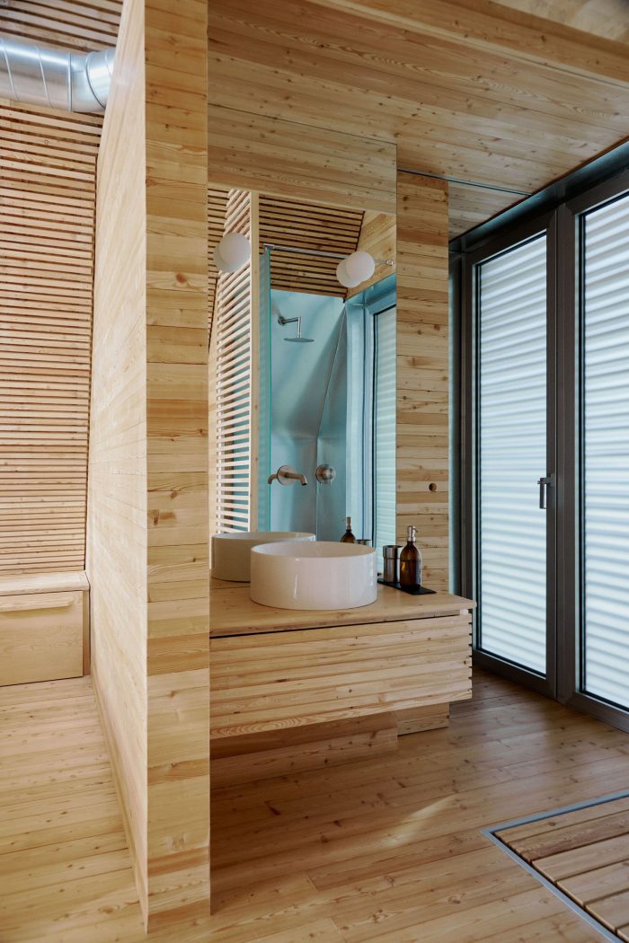 The interior of the three suites is organized as a continuum, with the breakfast nook near the deck leading to the sleeping area, which leads to the bathroom at the opposite end. The result is a refuge that ensures privacy, while also offering the option of entertaining other guests.