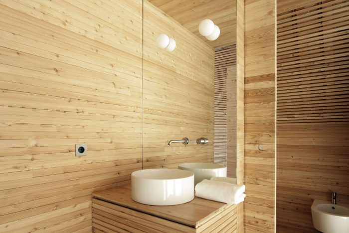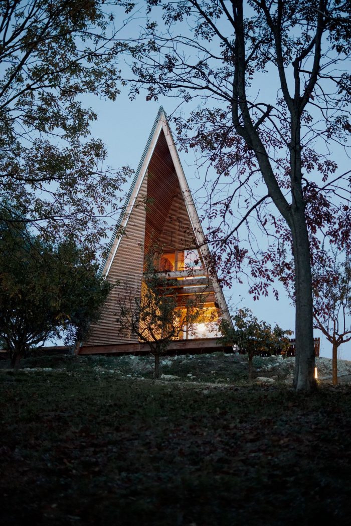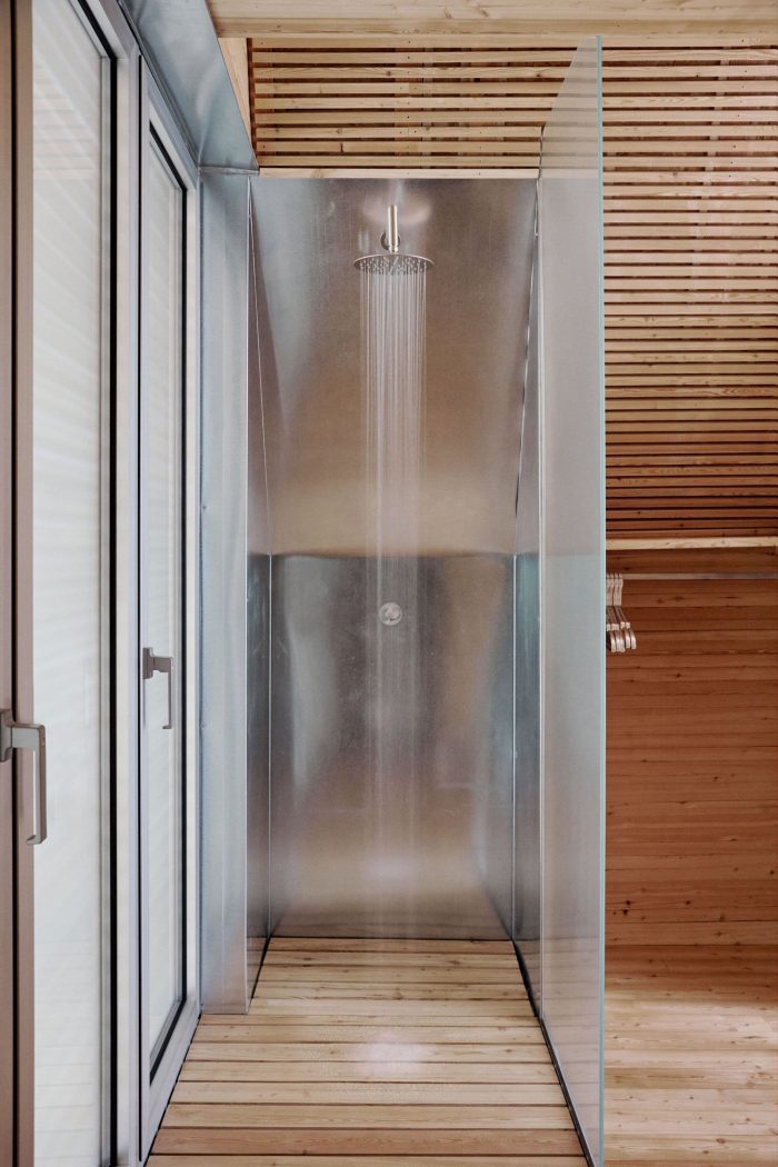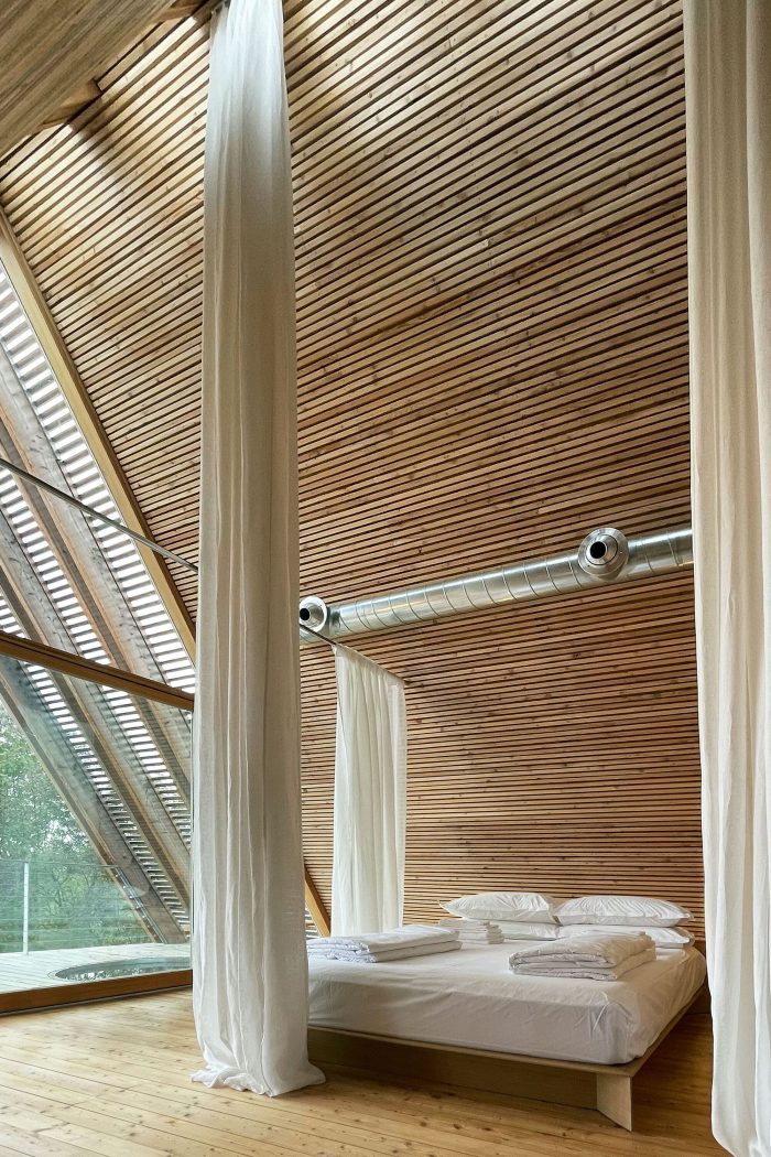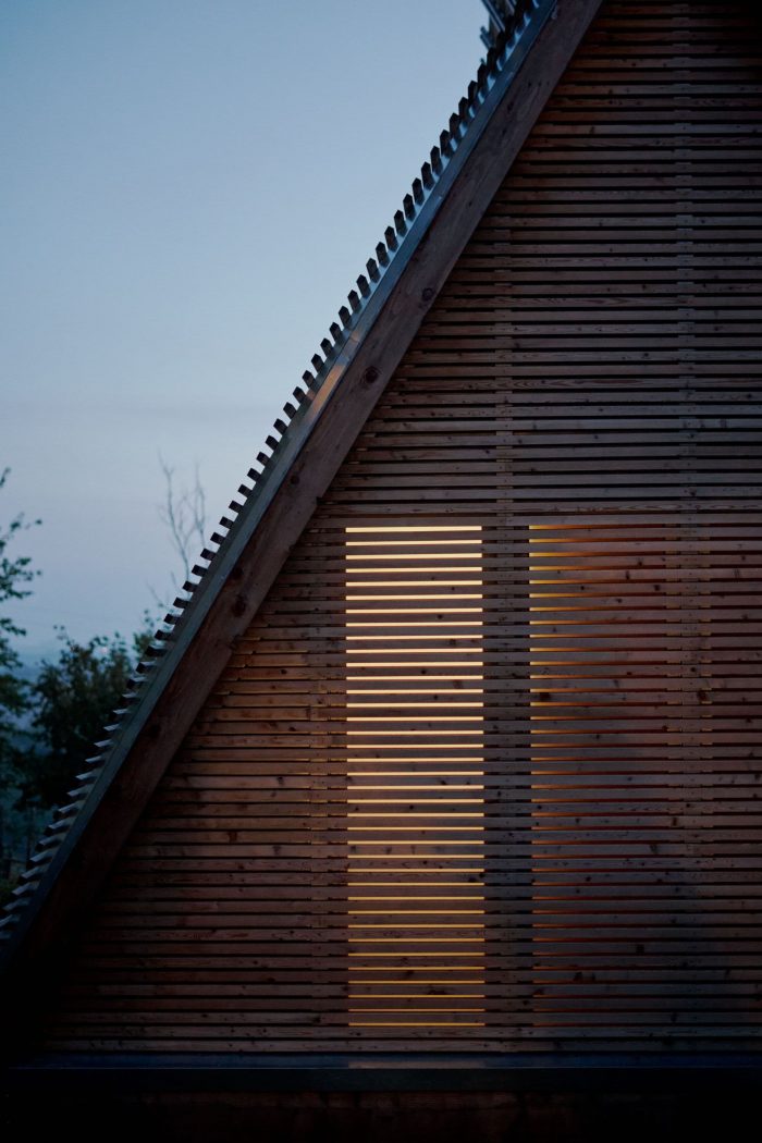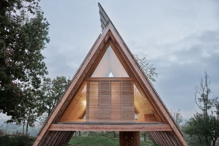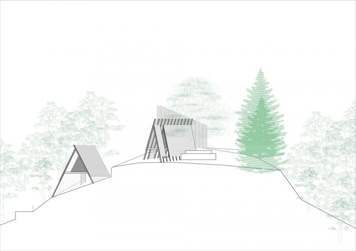 We took up the challenge of using prefabricated elements but without resorting to standardization. These factors are reflected in the roof, an A-shape with two fully glazed triangular elevations, which also acts as a wall and a load-bearing structure. The lodges weren’t designed as closed volumes from which the openings were subtracted, but as a space created by three inclined surfaces, following the Japanese logic of working on layers.