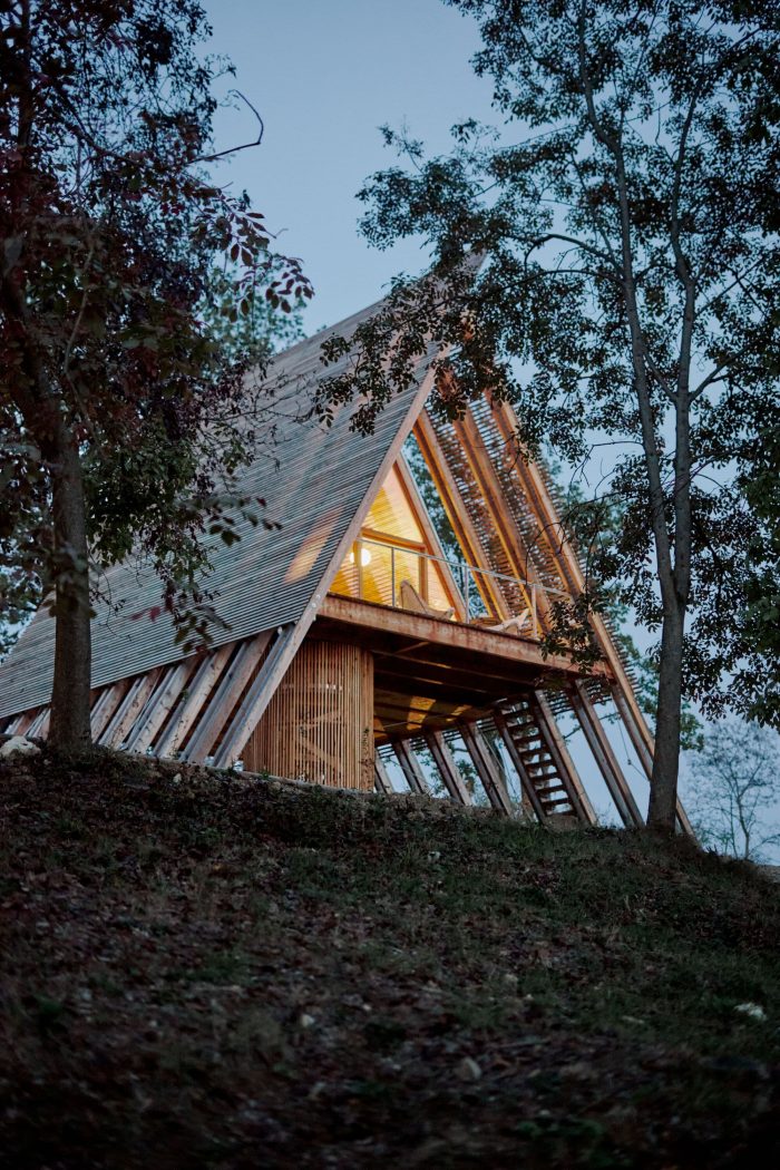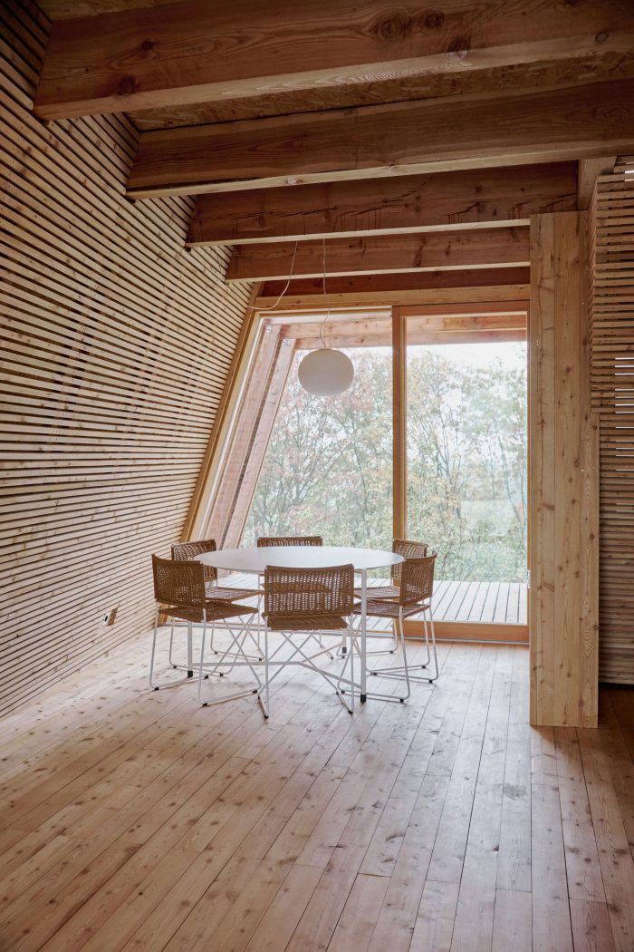 小木屋的设计着眼于可持续发展和能源效率,使用天然和生态兼容的材料,小木屋被抬离地面,这种施工方法响应了场地的倾斜土地。