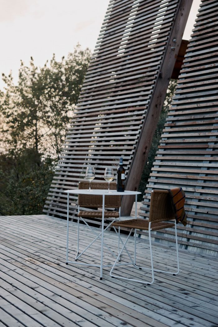 The last cabin comprises a generous outdoor space and a large kitchen. It was conceived more as a meeting place than a reception area, and includes a large table where guests can sit together.