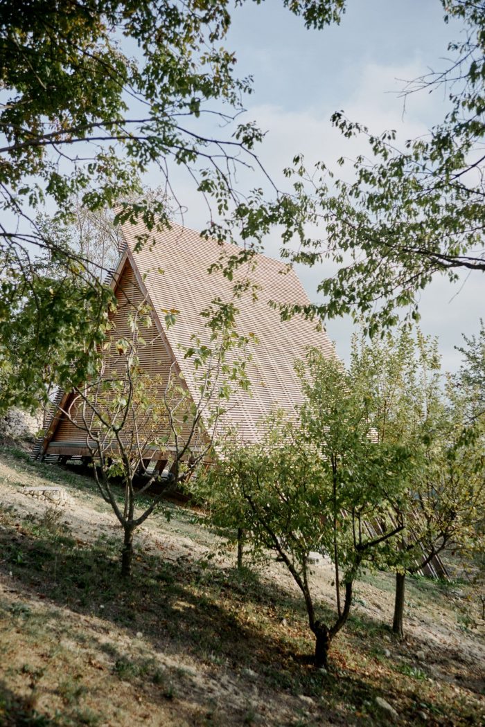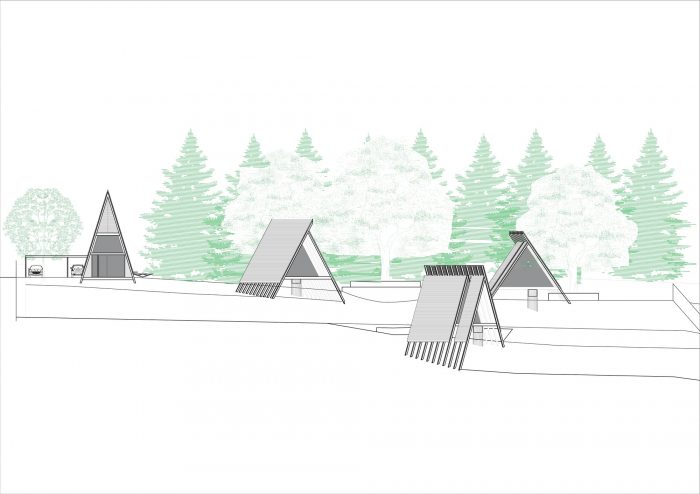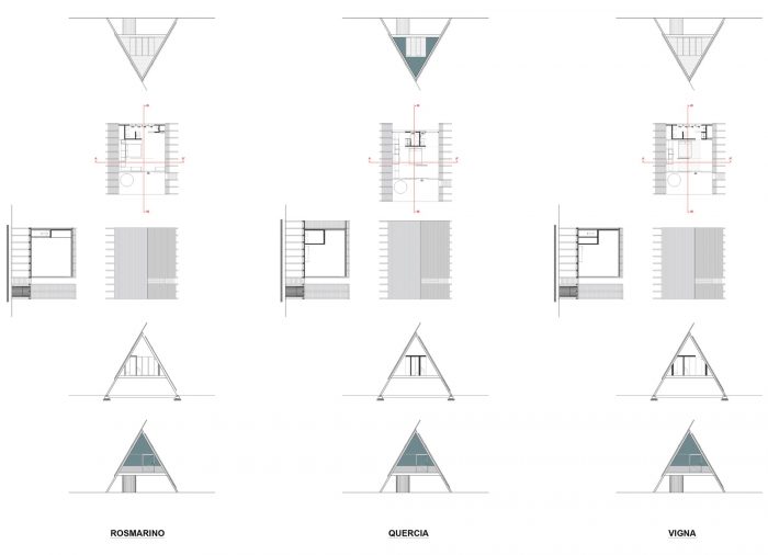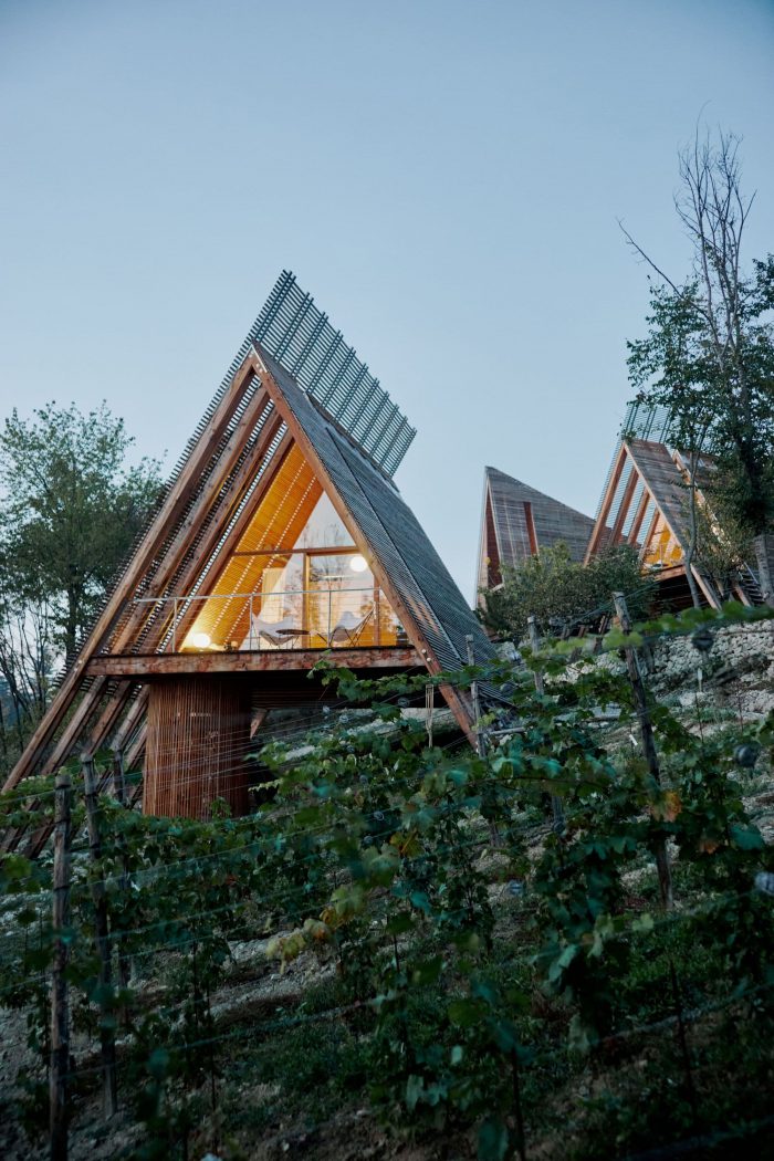 Designed with an eye on sustainability and energy efficiency using natural and eco-compatible materials, the cabins are raised off the ground, a construction approach that responds to the sloping land of the site.