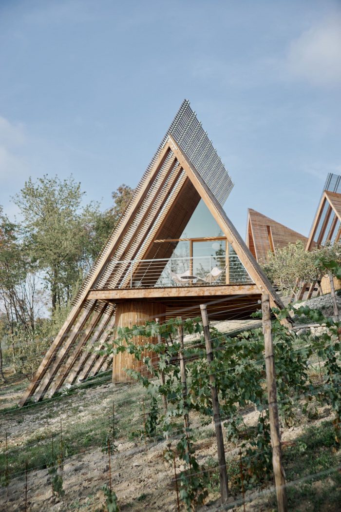 Set in a landscape of vineyards and wooded areas, in the heart of Monferrato, the eco-hotel comprises a village of four independent wood and glass cabins whose design was inspired by the image of traditional haystacks. Three of them house the suites, while the fourth is a common space.